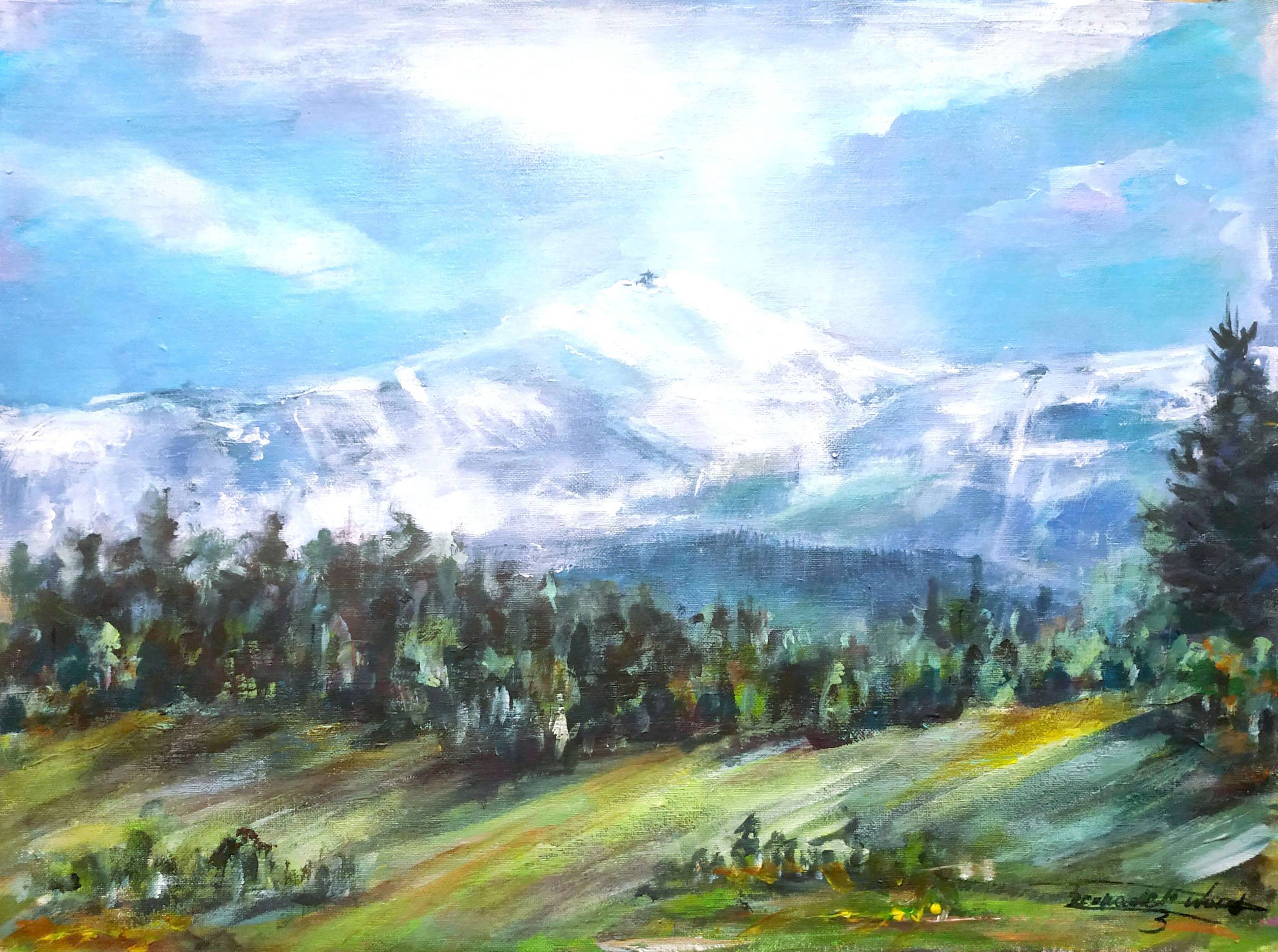 Ten obraz to prawdziwa podróż do świata natury. Na pierwszym planie widzimy zielone łąki, gdzieniegdzie poprzetykane ciemniejszymi plamami krzewów i drzew. Te kolory są żywe i świeże, niemal jakby sam wiatr przyniósł je prosto z górskich szczytów. Góry w tle są delikatnie pokryte śniegiem, który lśni w promieniach słońca, kontrastując z błękitem nieba. Kształty są miękkie, a pociągnięcia pędzla lekkie i płynne, co dodaje dziełu spokoju i harmonii. Atmosfera jest wręcz idylliczna, jakby czas się tu zatrzymał. Artysta zastosował technikę olejną, co nadaje obrazowi głębię.