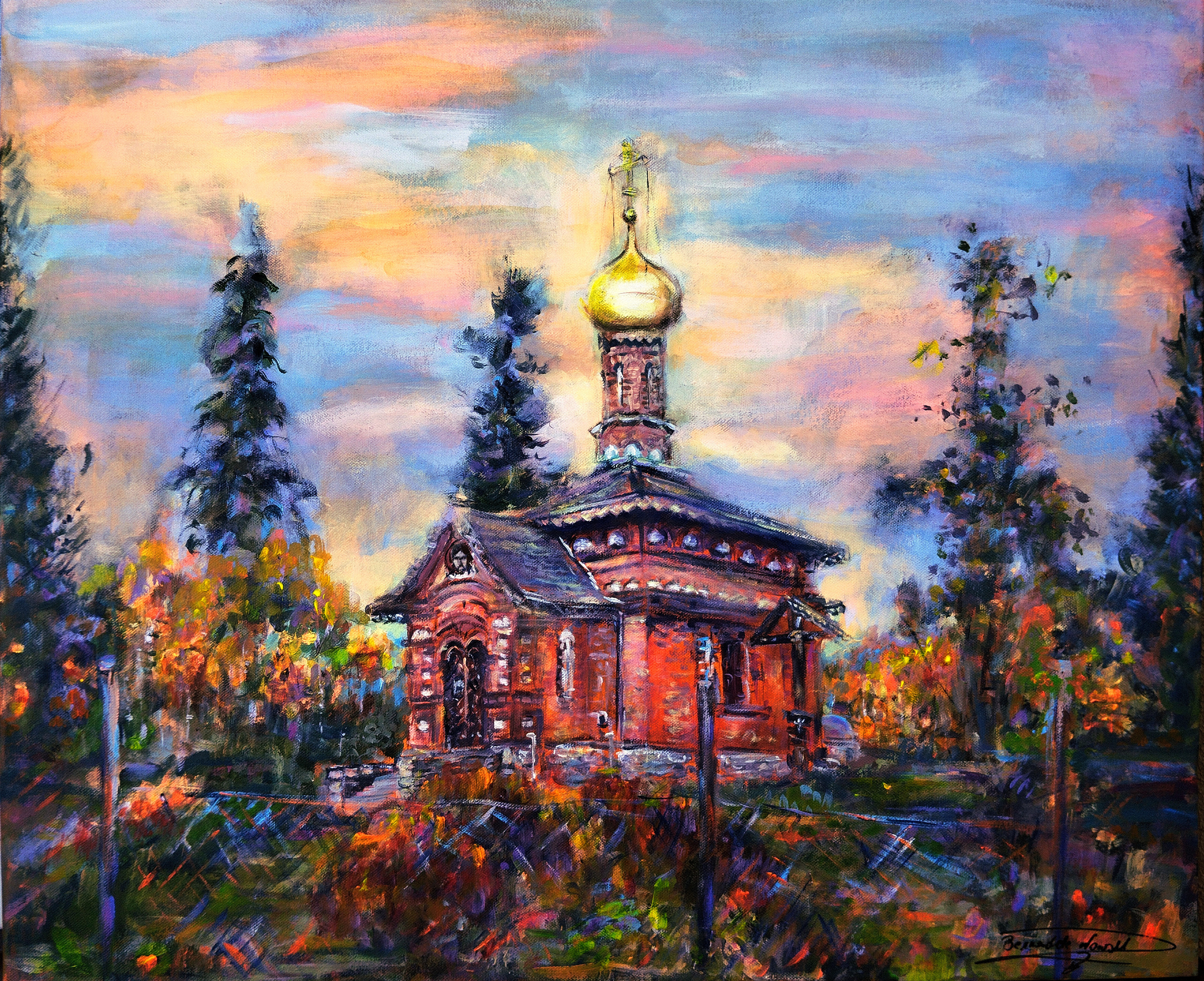 Na tym obrazie widzimy małą cerkiewkę, która zdaje się być otoczona tajemniczym lasem. Kolory są intensywne i nasycone, od czerwieni murów budynku po złote refleksy na dachu. Tło jest bajecznie zmienne, pastelowe odcienie niebieskiego, różu i pomarańczu mieszają się, tworząc złudzenie ruchu w niebie. Kompozycja przyciąga wzrok do środkowej części, gdzie złocista kopuła migocze w promieniach zachodzącego słońca. Czuć spokój, ale i nutkę nostalgii. Styl artystyczny przypomina impresjonizm z delikatnym akcentem ekspresji. Ten styl sprawia, że obraz wydaje się być żywy, niemal pulsujący od emocji. Czuję, że ktoś tutaj właśnie się modlił albo wkrótce to zrobi.