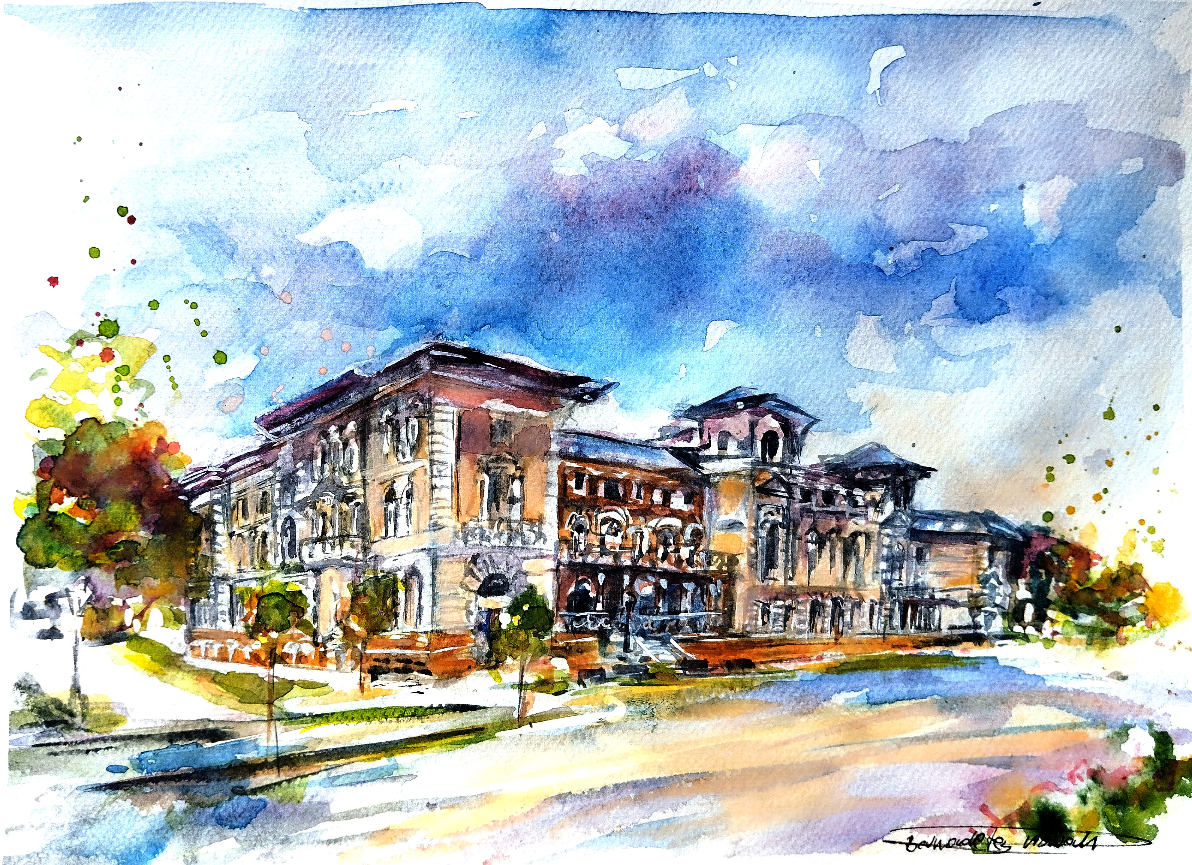 Obraz jest jak barwny kalejdoskop, pełen błękitów nieba, które delikatnie mieszają się z ciepłymi odcieniami ceglastych budynków. Główna struktura, solidna i majestatyczna, emanuje spokojnym urokiem XIX-wiecznej architektury. Linie fasady są rozmyte, co dodaje dziełu fluidności. Artysta zastosował technikę akwareli, pozwalając farbom swobodnie płynąć po papierze, kreując impresjonistyczny efekt. Atmosfera jest nieco nostalgiczna, jakby czas zatrzymał się na chwilę. Patrząc na ten obraz, możemy poczuć lekkość letniego popołudnia. Ten pejzaż to nie tylko estetyczne doświadczenie, ale też emocjonalna podróż do czasów bez pośpiechu. Elementy drzew ożywiają scenę, dodając do niej świeżej, zielonej energii. Chciałoby się tam być, po prostu usiąść i zasłuchać się w ciszę tej chwili.