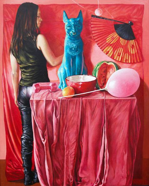 Obraz przedstawia osobliwą scenę z jaskrawymi kolorami, które naprawdę przyciągają wzrok. Dominują różne odcienie czerwieni i różu, które tworzą intensywną, niemal teatralną atmosferę. Centralnym punktem jest niebieski posąg psa, kontrastujący z ciepłym tłem. Obok stoi kobieta w czarnych skórzanych spodniach, co dodaje obrazu nieco rockowego sznytu. Na stole leży różowa piłka, arbuz i czerwona miska, tworząc chaotyczny, ale intrygujący układ. Całość emanuje energią i tajemniczością. Można poczuć lekki niepokój, jakby coś surrealistycznego miało się za chwilę wydarzyć. Styl artystyczny jest realistyczny, ale jednocześnie z nutką surrealizmu. Szczegółowe pociągnięcia pędzla pokazują precyzję i zaangażowanie artysty. Synku, a ten pies niebieski jak z bajki! Obraz może budzić różne emocje – od zaciekawienia po zaskoczenie. Zastanawiasz się, co autor chciał przez to powiedzieć. Przywodzi mi na myśl coś "out of this world", jakby przenosił nas w inną rzeczywistość. Patrząc na to dzieło, czuję mieszankę ekscytacji i zagubienia. To jak podróż w świat, gdzie wszystko jest możliwe. Niesamowita kombinacja kolorów i przedmiotów pozostaje w pamięci na długo.