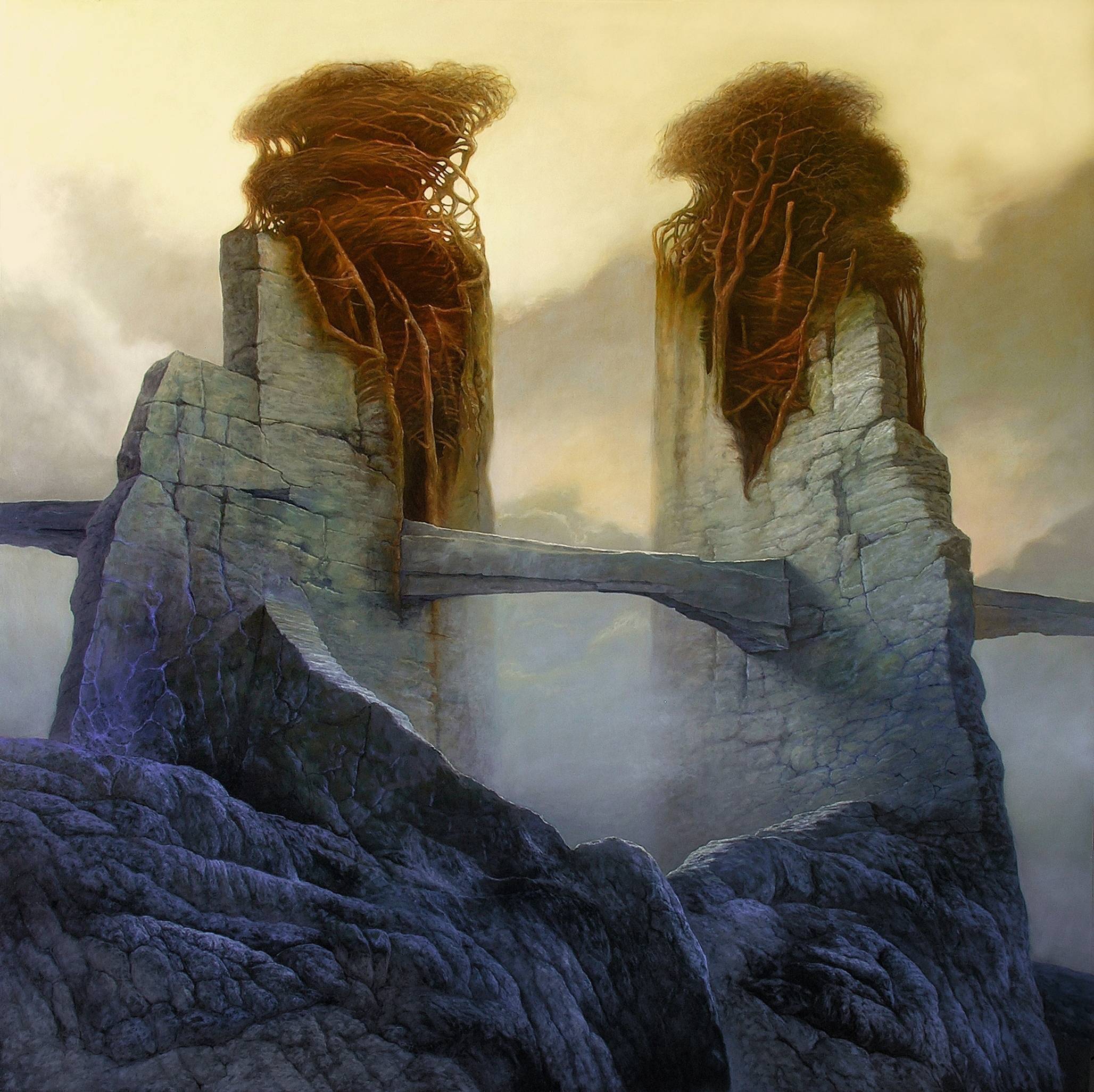 Obraz przedstawia dwa monumentalne, kamienne filary, które wznoszą się dumnie ku niebu. Ich szczyty zdobią splątane korzenie, przypominające dynamiczne, rdzawe włosy tańczące na wietrze. Tło jest stonowane, utrzymane w delikatnych odcieniach szarości i beżu, co podkreśla mistyczny charakter kompozycji. Look at those roots! Pomiędzy kolumnami rozciąga się tajemniczy most, który przyciąga wzrok i skłania do pytań. Co on łączy? Atmosfera obrazu jest niezwykła. Krążący wokół lekki mrok dodaje mu tajemniczości, a unosząca się mgła wprowadza element niepewności. Artysta zastosował subtelne przejścia tonalne, łączące realizm z fantazją. Rysunki są precyzyjne, a zarazem mają coś z sennej wizji. Obraz budzi refleksję nad siłą natury. Twe góry wyglądają jak okna do innych światów. Odbiorcy mogą odczuwać nostalgię i podziw, zastanawiając się, jakie historie kryją się za tą potężną architekturą z marzeń.