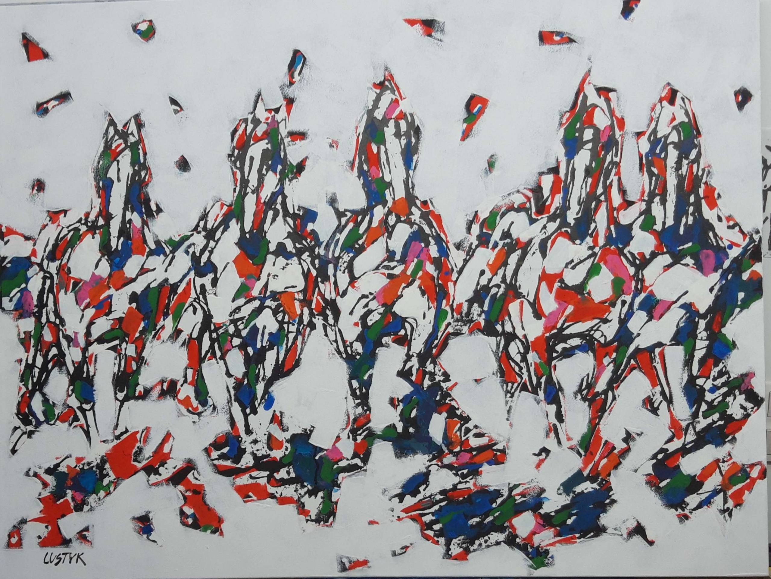 Na obrazie widzimy dynamiczną kompozycję, pełną energii i ruchu. Dominują żywe kolory: głęboka czerwień, niebieski i zieleń, które przeplatają się z bielą i czernią. Wszystko to tworzy abstrakcyjne sylwetki koni i jeźdźców. Wrażenie chaosu, ale takiego, który ma sens. Artysta użył wyrazistych, swobodnych pociągnięć pędzla, jakby chciał uchwycić moment w biegu. Prawie jakby te konie zaraz miały wyskoczyć z płótna. Atmosfera obrazu jest pełna napięcia. Czuje się jakby coś ważnego miało się wydarzyć. Te wibrujące kolory sprawiają, że obraz żyje. Mówiąc serio, to sztuka współczesna w najlepszym wydaniu. Technika przypomina dynamiczne graffiti, łączące avant-garde z ekspresją. Kiedy patrzę na te kolory i kształty, czuję, że coś się we mnie budzi. Możliwe, że to radość, albo nostalgia za czymś nieokreślonym. Myślę sobie "wow", to może być o wolności. Może o walce. Chłopczyk powiedziałby: te konie wyglądają jak w moim marzeniu. I to jest clue całej tej impresji. Czasem sztuka robi się magiczna bez konkretnego why. To tu się zdecydowanie udało, truly.