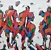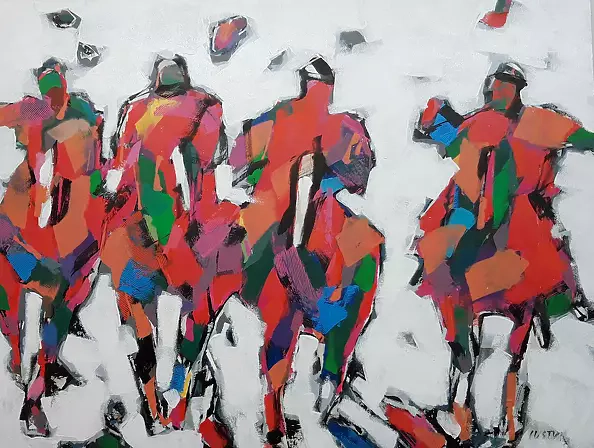 Obraz przedstawia dynamiczną scenę pełną kolorów i ruchu. Dominują intensywne odcienie czerwieni, zieleni i błękitu, które splatają się w abstrakcyjne formy. Wydaje się, że widzimy cztery postacie, być może jeźdźców na koniach. Kompozycja jest nieco chaotyczna, co dodaje energii całemu dziełu. Artysta zastosował technikę impasto, dosłownie nakładając farbę gęsto, co daje efekt trójwymiarowości. Kiedy patrzę na ten obraz, czuję lekki niepokój, ale i fascynację. Coś jak oglądanie wyścigu. Dla mnie to jak wybuch energii, tak jakby cały świat wibrował w tym momencie. Nastrój w dziele jest nieuchwytny – z jednej strony porywający, z drugiej nieco onieśmielający. Wygląda jak wyjęty z dziecięcej wyobraźni, pełen ruchu i spontaniczności. Mówię sobie „Wow”, bo naprawdę robi wrażenie. Stylem przypomina trochę dzieła awangardowe, takie jak te z lat 60. Taka artystyczna jazda bez trzymanki. I wtedy myślę: "Chcę tu wejść i poczuć to na własnej skórze!" Jak mówi siedmiolatek: "Koń się ściga z tęczą!" Ten artystyczny chaos przyciąga, zmusza do zastanowienia. To jest po prostu amazing.