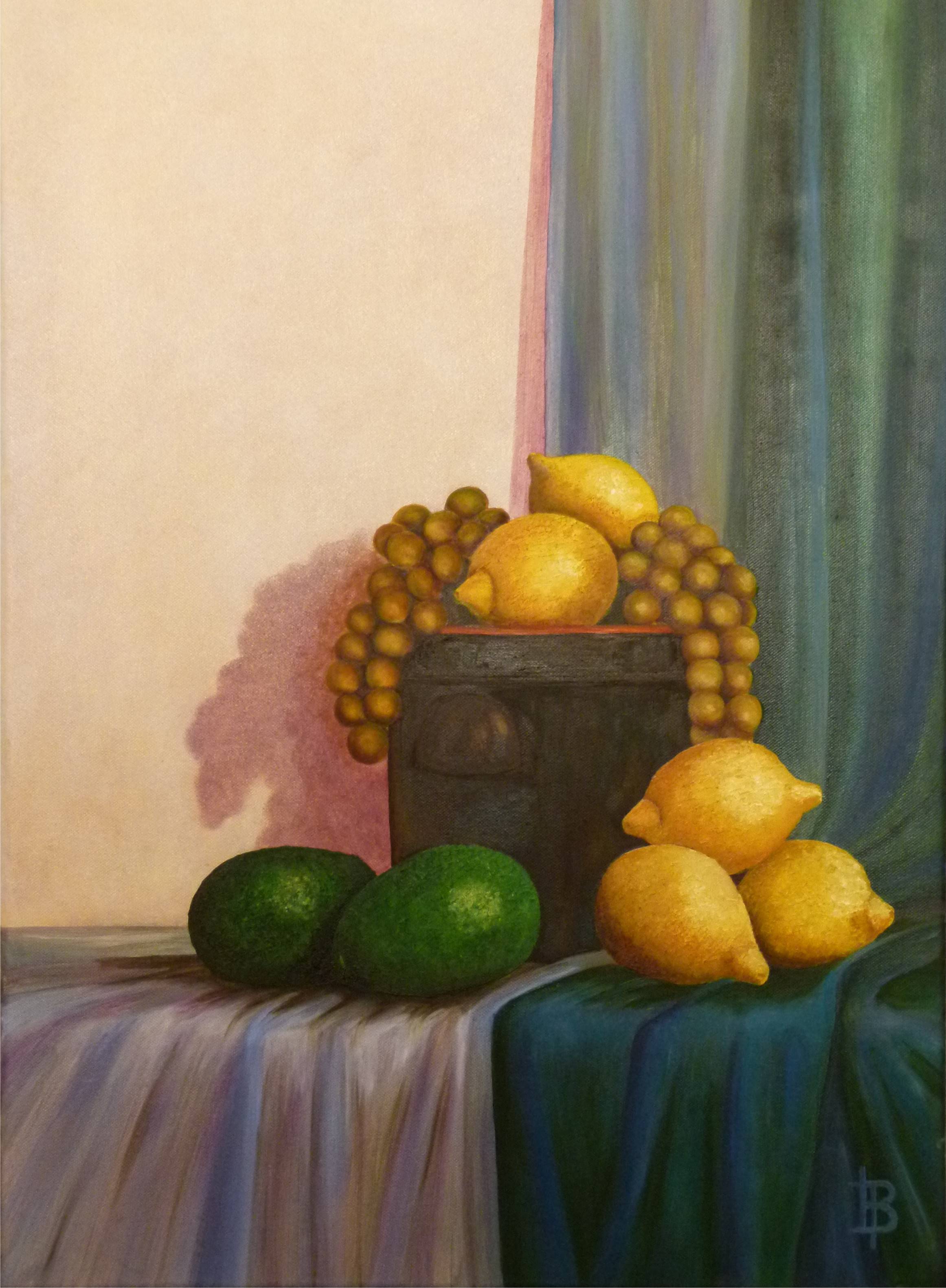 Na obrazie widzimy klasyczne martwe naturę. Kompozycja jest harmonijna, z miękkim światłem podkreślającym soczyste cytryny, które leniwie opierają się na czarnym pudełku. Obok nich, kiść winogron układa się w półkole, jakby chciała przyciągnąć uwagę widza. Zielone, połyskujące awokado dodają kontrastu swoim ciemnym odcieniem. Tło to delikatna gra kolorów, od beżowego po ciemny, tajemniczy granat, co dodaje obrazowi głębi. Atmosfera obrazu jest spokojna i medytacyjna. Artysta zastosował subtelne pociągnięcia pędzla, co świadczy o dojrzalej technice. Patrząc na to, można się zrelaksować, poczuć nostalgia. Jakby czas się zatrzymał. "Look, lemons!" powiedziałoby dziecko. Światło i cienie są tu mistrzowskie, wręcz magiczne. To old-school beauty w pełnej krasie! Obraz może budzić wrażenie spokoju, ale także przypominać o prostocie codziennych chwil.