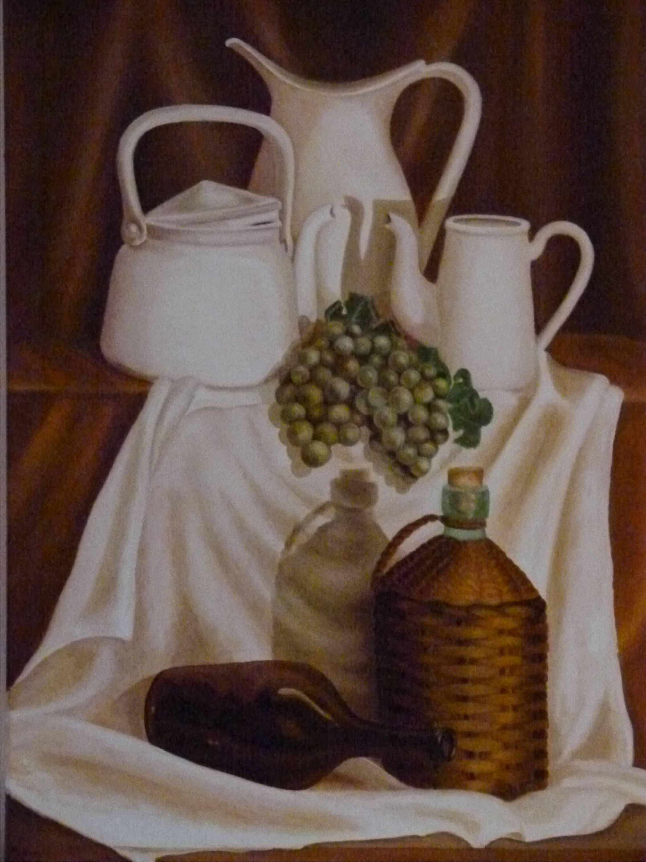Obraz przedstawia martwą naturę z subtelną kompozycją białych dzbanków, czajników i winogron ułożonych na białym obrusie. Tło w ciepłych, brązowych tonacjach dodaje głębi i kontrastu. Artysta użył delikatnych pociągnięć pędzla, aby stworzyć realistyczną fakturę zarówno ceramiki, jak i owoców. Nastrój dzieła jest spokojny, niemal melancholijny, a zarazem elegancki. To przypomina cichy poranek, kiedy wszystko jeszcze śpi. Styl artystyczny jest klasyczny, a technika malarska zdradza dbałość o detal. Widać, że artysta bawił się światłem i cieniem, tworząc trójwymiarowość przedmiotów. Może sprawiać, że odbiorca myśli o prostocie dawnych czasów, kiedy rzeczy codzienne były celebrowane. U mnie wywołuje to skojarzenie z ciepłem rodzinnego domu i obietnicą dobrego jedzenia. Patrząc na ten obraz, dziecko mogłoby powiedzieć: "Te dzbanki wyglądają, jakby zaraz chciały mówić!" Jest tu coś magicznego i nostalgic, co przyciąga uwagę. Jedno spojrzenie i czuć cichą rozmowę między przedmiotami. Obraz, choć statyczny, ożywa w naszym umyśle. Każdy element zdaje się szeptać swoją historię.