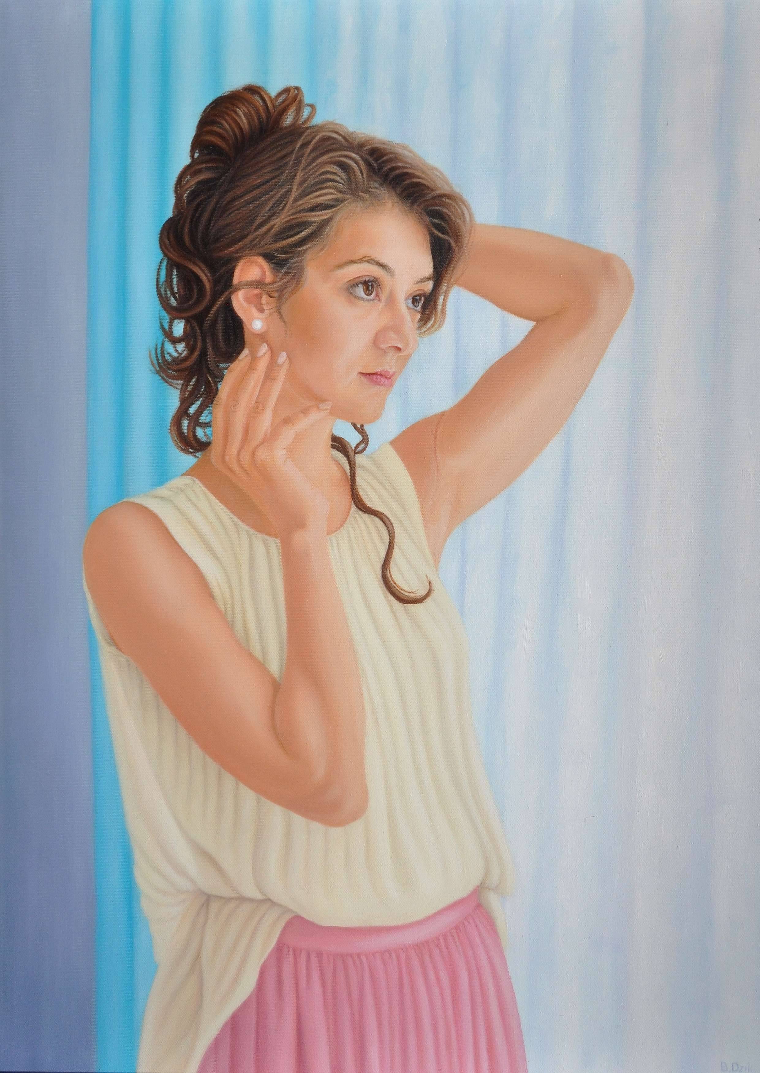 Obraz przedstawia młodą kobietę w spokojnej, skupionej pozie. Jej spojrzenie jest melancholijne, odrobinę nieobecne. Dominujące kolory to delikatne, pastelowe odcienie błękitu i różu, które tworzą przyjemny, kojący kontrast. Tło jest subtelnie rozmyte, co sprawia, że postać staje się centralnym punktem kompozycji. Artysta zastosował realistyczny styl, dokładnie oddając detale, takie jak faktura skóry czy strukturę włosów. Dzięki łagodnym pociągnięciom pędzla obraz emanuje spokojem i niewinnością, almost like a gentle whisper. Jest w tym coś nostalgicznego, może wspomnienie dawno minionych letnich dni. Dziecko mogłoby powiedzieć: "Jej włosy są jak czekoladowe lody". Obraz może wywołać w widzu refleksje nad ulotnością chwili. Artysta uchwycił moment zadumy, który każda z nas zna. Patrząc na obraz, odnosi się wrażenie, że czas na chwilę się zatrzymał. Przenika go ciepło i delikatność, które skłaniają do zatrzymania się na chwilę, do westchnienia. To dzieło, które choć spokojne, pozostawia w duszy echo.