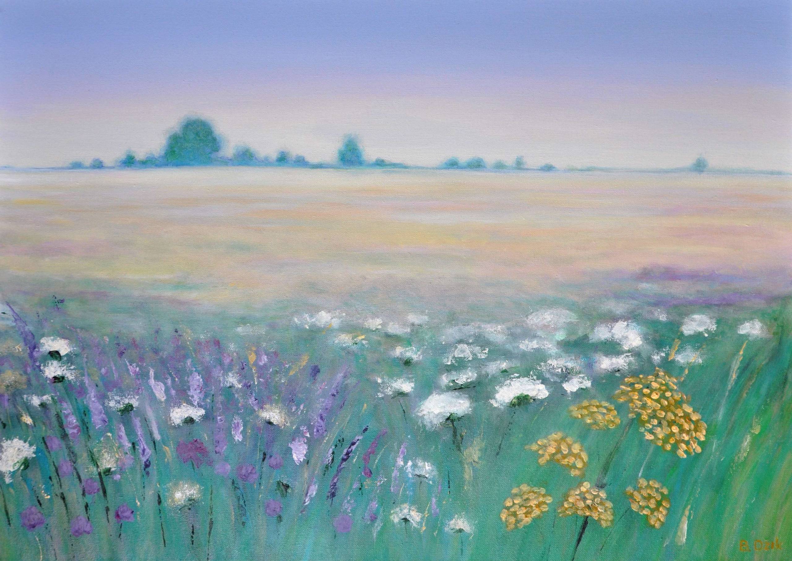 Obraz, który widzimy, przedstawia idylliczny krajobraz polnej łąki. Dominują tu spokojne pastele – rozmyte odcienie zieleni, bieli i fioletu, które tworzą niemal senną atmosferę. Na pierwszym planie widać kwiaty, białe i żółte, które tańczą na wietrze. Te delikatne pociągnięcia pędzla nadają im lekkość, sprawiając, że zdają się kołysać jak w rytm gentle breeze. W tle widać zamazane drzewa, które zaledwie wyłaniają się z horyzontu, jakby ukrywały się za zasłoną mgły. Kompozycja obrazu prowadzi wzrok od lewej strony do prawej, tworząc wrażenie przestrzeni i niekończącej się łąki. Nastrój dzieła jest spokojny, niemal medytacyjny, zachęcający do chwili refleksji i zatracenia się w przyrodzie. Artysta użył techniki impresjonistycznej, z miękkimi przejściami kolorów i grą światła, co dodaje obrazu subtelnej dynamiki. To zdjęcie jest jak letnie popołudnie, które wiecznie trwa w swojej sielankowej doskonałości. Patrząc na nie, można poczuć przyjemne ciepło słońca na skórze, a w sercu wzbudza się nostalgia za beztroskimi dniami. Interpretacje tego obrazu mogą być różne. Dla jednych będzie to symbol spokoju i harmonii, dla innych przypomnienie o kruchej urodzie natury, którą warto chronić. "Te kwiatki są piękne!" - powiedziałoby dziecko, zauważając prostotę i magię przyrody. Dla mnie osobiście, obraz ten emanuje poczuciem ukojenia, jakby chciał powiedzieć "zatrzymaj się na chwilę, przysiądź i oddychaj".