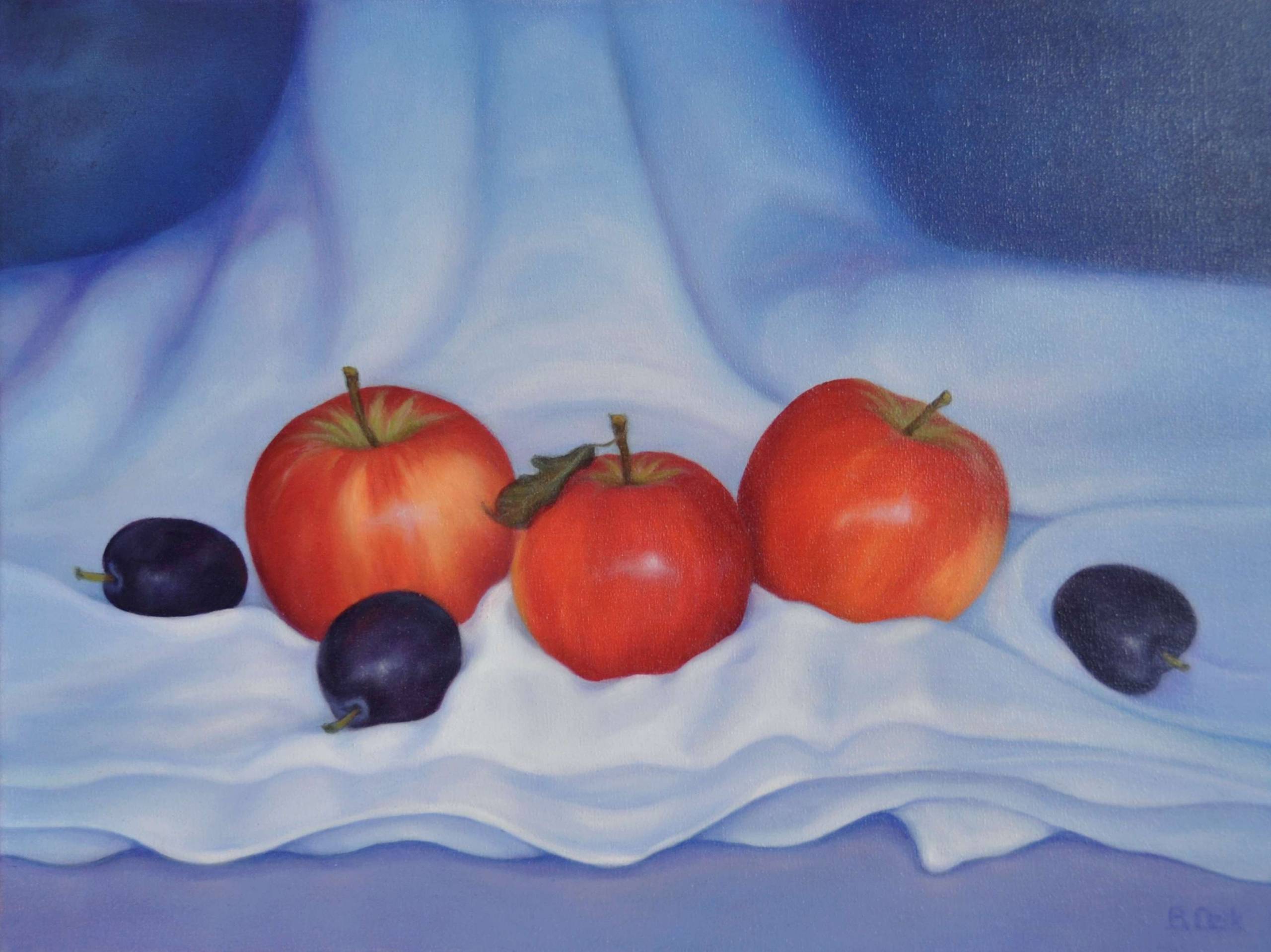 Na obrazie widzimy urokliwą martwą naturę złożoną z trzech jabłek i trzech śliwek, które rozmieszczone są na białym tle tkaniny. Kolory są intensywne, z wyraźnym kontrastem między soczystą czerwienią jabłek a głębokim fioletem śliwek. Biała tkanina, delikatnie pofalowana, tworzy miękkie linie, które prowadzą wzrok przez kompozycję. Artysta zastosował subtelne przejścia tonalne, co dodaje dziełu głębi i harmonii. Obraz emanuje spokojem i ciszą, jakbyśmy byli w bezruchu w letni dzień. To kind of relaxation is palpable. Styl dzieła przypomina klasyczne malarstwo martwych natur, z naciskiem na realistyczne odwzorowanie i detale. Równocześnie, jest w nim coś nieuchwytnego, ulotnego. Patrząc na ten obraz można poczuć delikatny zapach owoców lub przypomnieć sobie ciepłe wspomnienia z letnich pikników. To prawdziwa uczta dla zmysłów. Mamo, te jabłka wyglądają jak prawdziwe! Obraz może wywoływać uczucie nostalgii i pragnienie zatrzymania chwili. Patrząc na ten obraz można pomyśleć o chwilach pełnych prostoty i piękna.