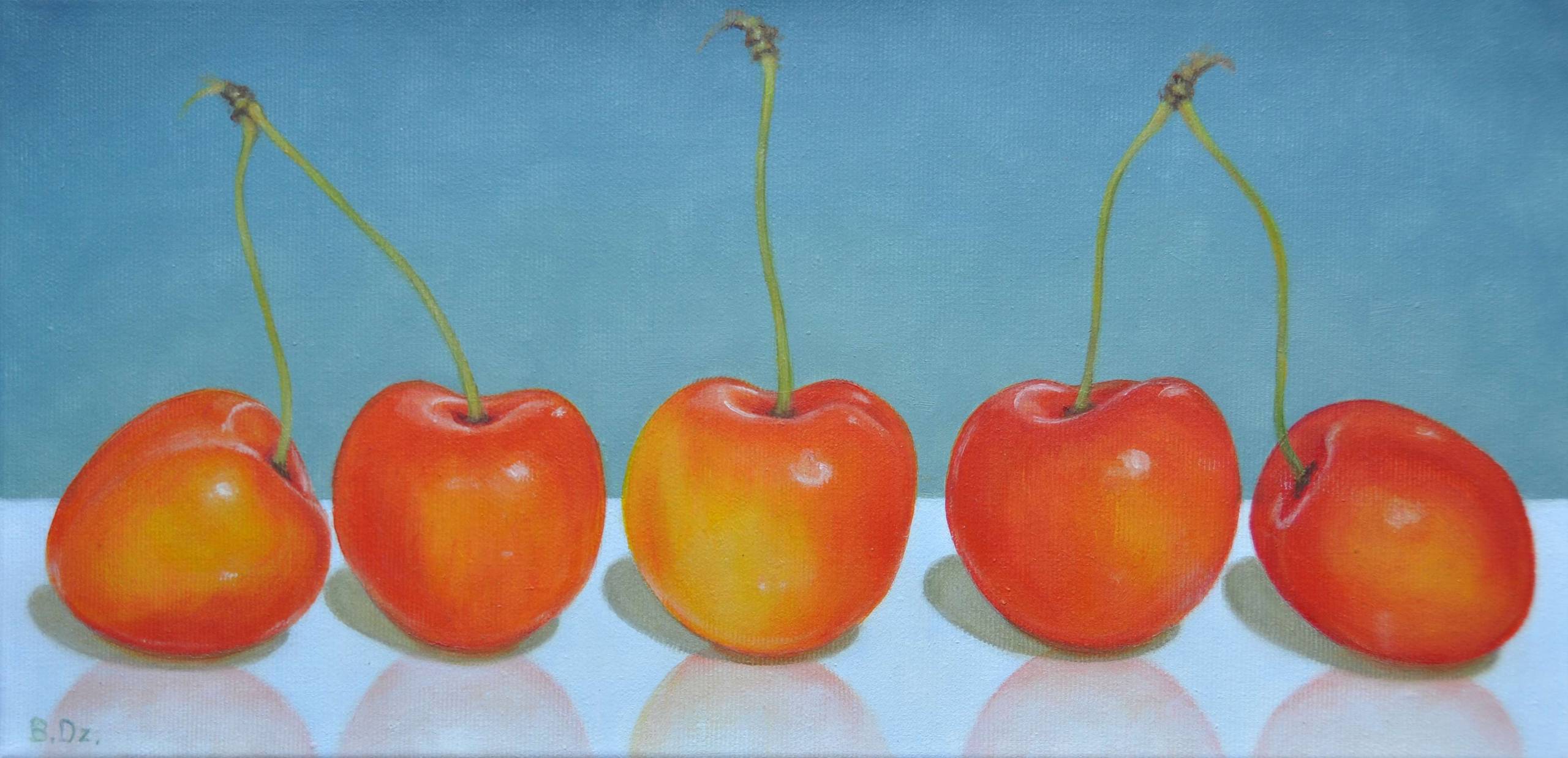 Na obrazie widzimy pięć soczystych wisienek, które jakby roztańczone stoją najednej linii. Ich skórki lśnią w odcieniach czerwieni i pomarańczy, co daje wrażenie, jakby były zaraz gotowe do schwytania. Tło to delikatna, pastelowa zieleń, przypominająca uspokajające letnie niebo. Kompozycja jest niezwykle harmonijna, z równomiernym rozmieszczeniem owoców na jasnej powierzchni, która wydaje się odbijać słońce. Obraz emanuje radością i beztroską. Kiedy patrzę na te wisienki, przypomina mi się smak lata, beztroskie dni dzieciństwa i przygody w sadzie. Artysta zastosował subtelne cieniowanie, nadając owocom trójwymiarowości. Technika jest realistyczna, ale z lekkim emocjonalnym twistem, który sprawia, że czujemy ciepło płynące z płótna. Dziecko powiedziałoby: "Ja chce zjeść te wisienki teraz!" Każdy, kto patrzy na ten obraz, może poczuć uśmiech na twarzy i nutkę nostalgii. To "perfect" połączenie sztuki i emocji, które przenosi nas w spokojne miejsce, wolne od codziennych trosk. Wisienki mówią „hej, weź trochę czasu na radość”, a ja słucham, z zadowolonym westchnieniem.