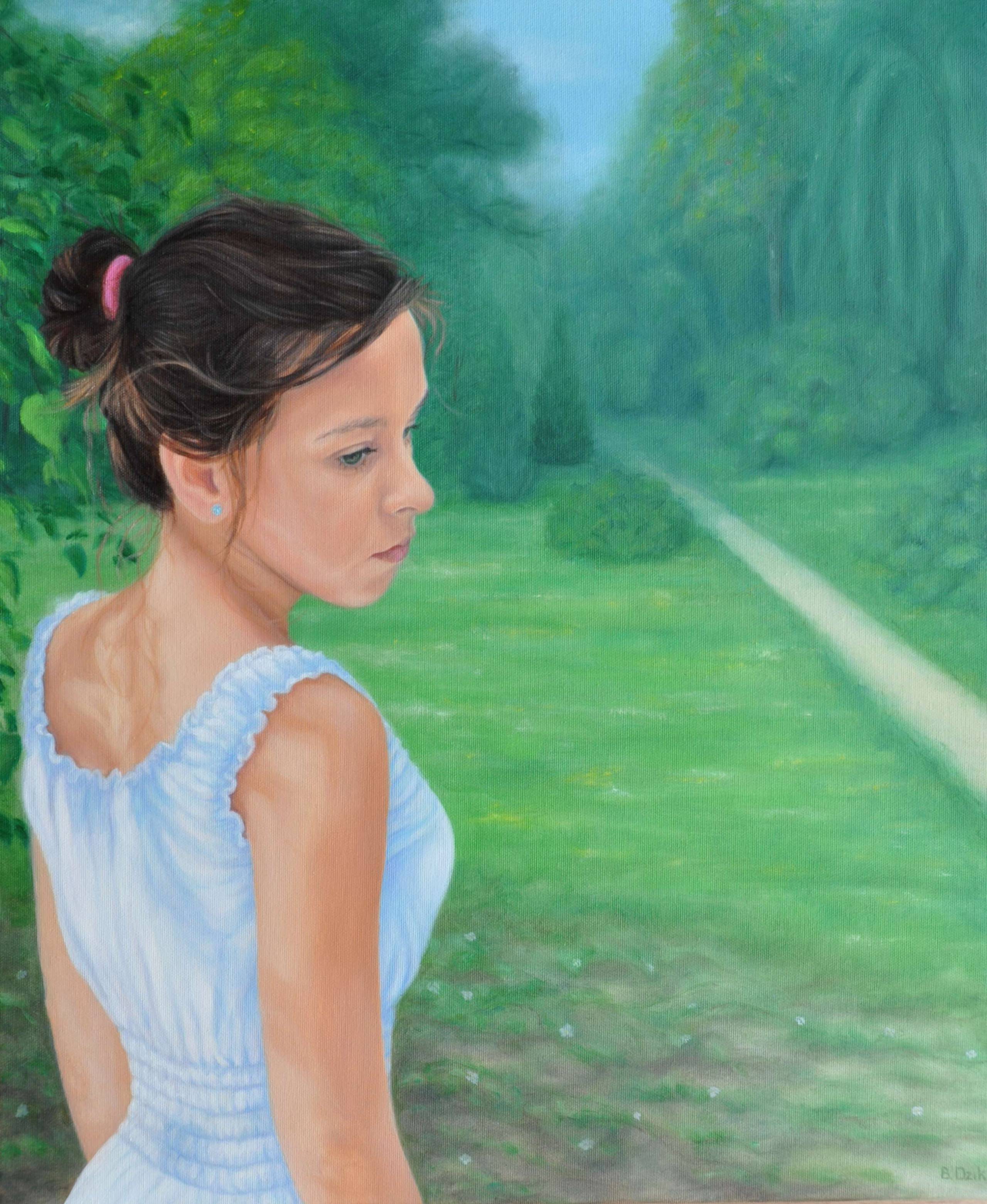 Na obrazie widzimy młodą dziewczynę na tle bujnej, zielonej scenerii. Ubrana w delikatną, białą sukienkę, stoi bokiem, patrząc gdzieś w dal. Jej twarz, pełna subtelnych emocji, przyciąga uwagę. Otaczają ją zieleń i błękit nieba, co nadaje całości spokojny, niemal sielankowy nastrój. Od lewej strony dominuje głęboka zieleń drzew i krzewów, które gdzieniegdzie rozjaśniają promienie słońca. Styl obrazu przypomina impresjonizm, z miękkimi pociągnięciami pędzla i delikatnymi przejściami kolorów. Artysta świetnie uchwycił grę światła i cienia, dodając dziełu głębi i realizmu. A feel of nostalgia przenika całość, budząc wspomnienia beztroskich letnich dni. Obraz może wywoływać w odbiorcy różnorodne emocje. Spokój, ciepło, a nawet lekką melancholię – każdy odnajdzie tu coś innego. Dziewczynka zdaje się być zamyślona, jakby próbowała rozwiązać zagadkę życia lub po prostu przesiąknęła chwilą. Patrząc na ten obraz, można niemal poczuć zapach trawy i usłyszeć szum liści. Myślę sobie: „Też kiedyś tak myślałem o przygodach!” – to coś, co mógłby powiedzieć 7-letni chłopiec. To dzieło, które zostaje w pamięci na dłużej.