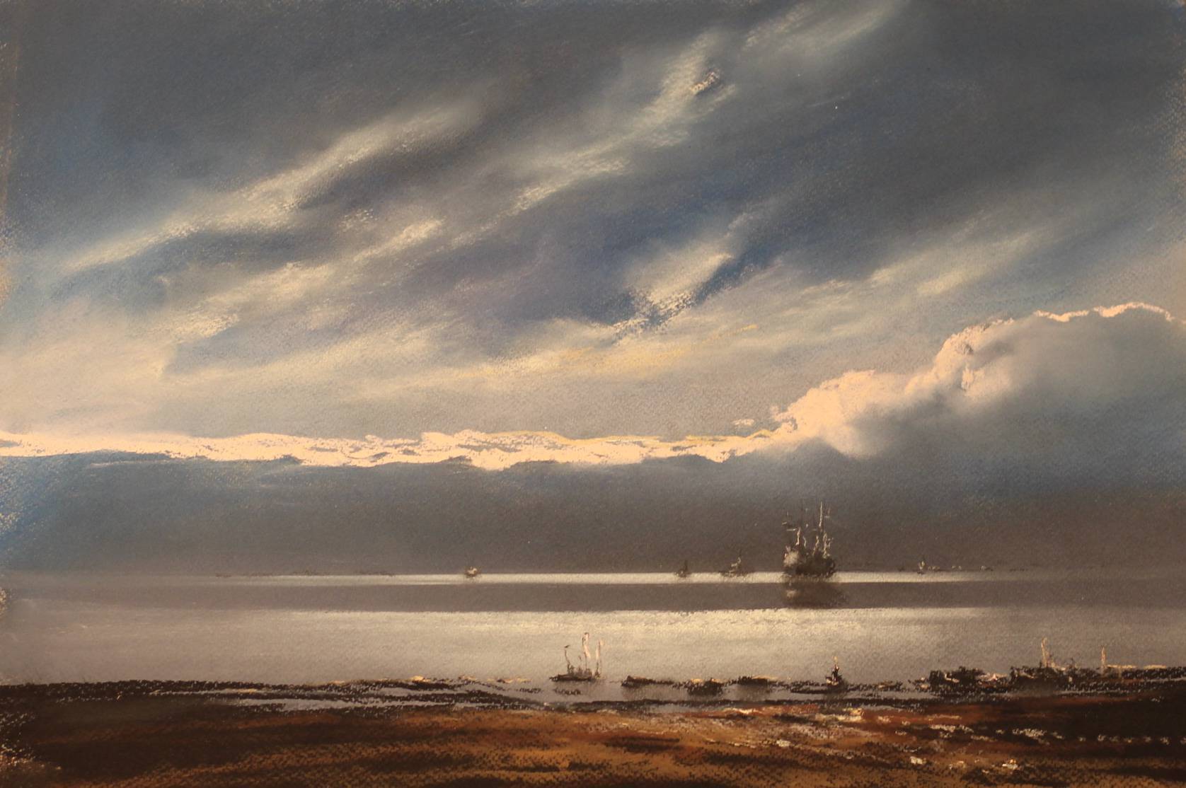 Obraz przedstawia spokojne, rozciągające się aż po horyzont morze. Dominują tu chłodne odcienie błękitu i szarości, przeplatane miękkimi pasmami światła odbijającego się na wodzie. Nad taflą unoszą się magiczne chmury, które dodają tajemniczej głębi całemu dziełu. A na tym tle widać kilka statków, które dryfują nieśpiesznie jakby chciały zdążyć na horyzont zanim słońce zniknie na zawsze. Artysta użył delikatnych pociągnięć pędzla, co nadaje scenie płynności i spokojnej atmosfery. Technika malarska, choć subtelna, przekazuje poczucie przestrzeni. Obraz ten emanuje ciszą i harmonią, budząc refleksję nad upływającym czasem i ogromem natury. Patrząc na to dzieło, można poczuć lekką tęsknotę za nieznanym. Jakby te statki miały prowadzić nas ku nowym horyzontom. Hey, mama! Tam są statki, które płyną jak w bajce! W obrazie czuć nutkę melancholii, ale też nadziei na nowe początki. Można zastanawiać się, gdzie płyną. Gdzieś daleko? Czy może do miejsca, gdzie czas przestaje mieć znaczenie? To, co najbardziej urzeka, to spokój, który promieniuje z każdego zakątka. A jednak jest w tym coś, co sprawia, że chce się tam być. Uczucie freedom, jakby nic nas nie ograniczało. Malowidło to prawdziwa poezja w obrazach, z delikatnym szeptem morskim w tle.