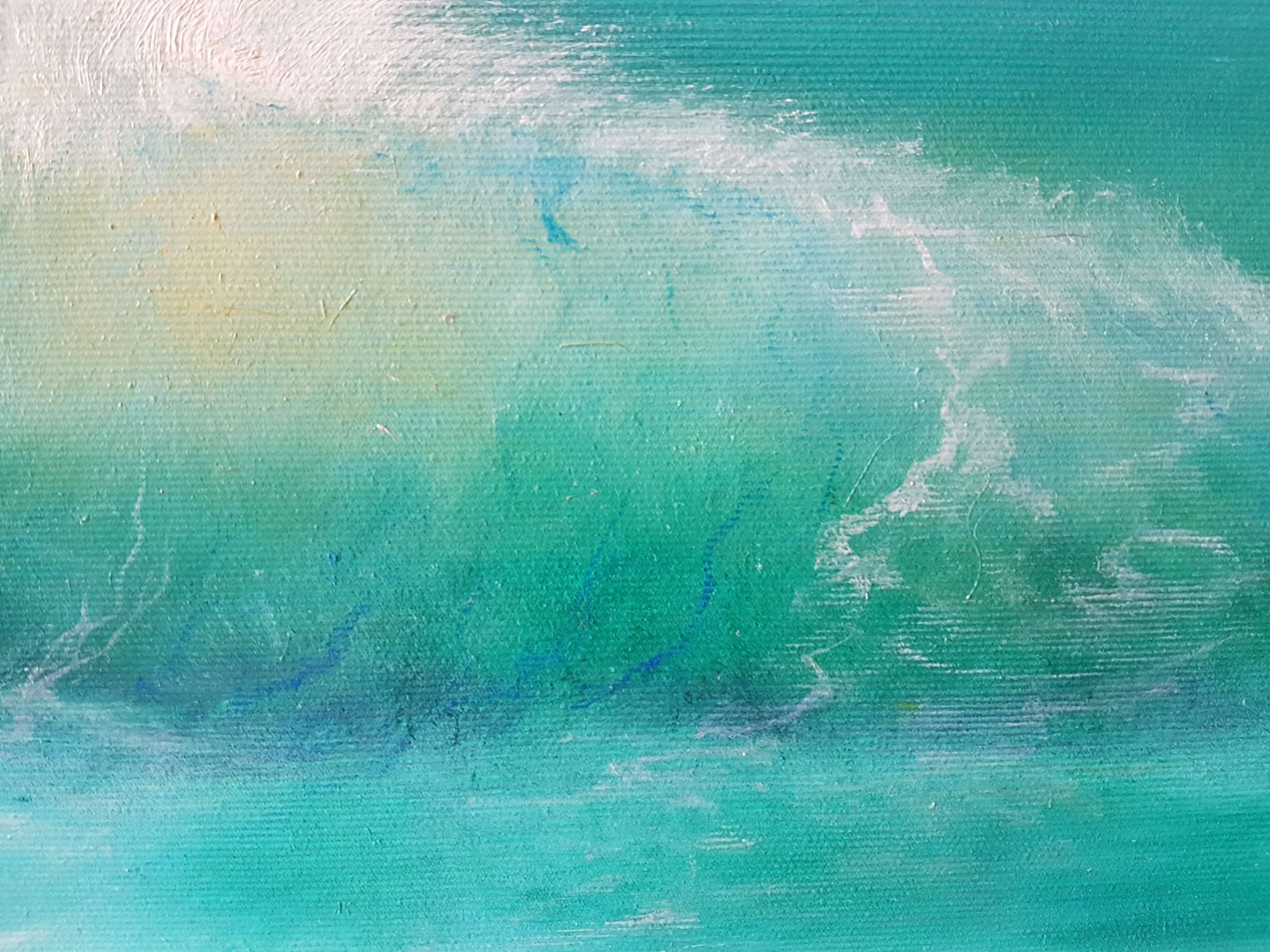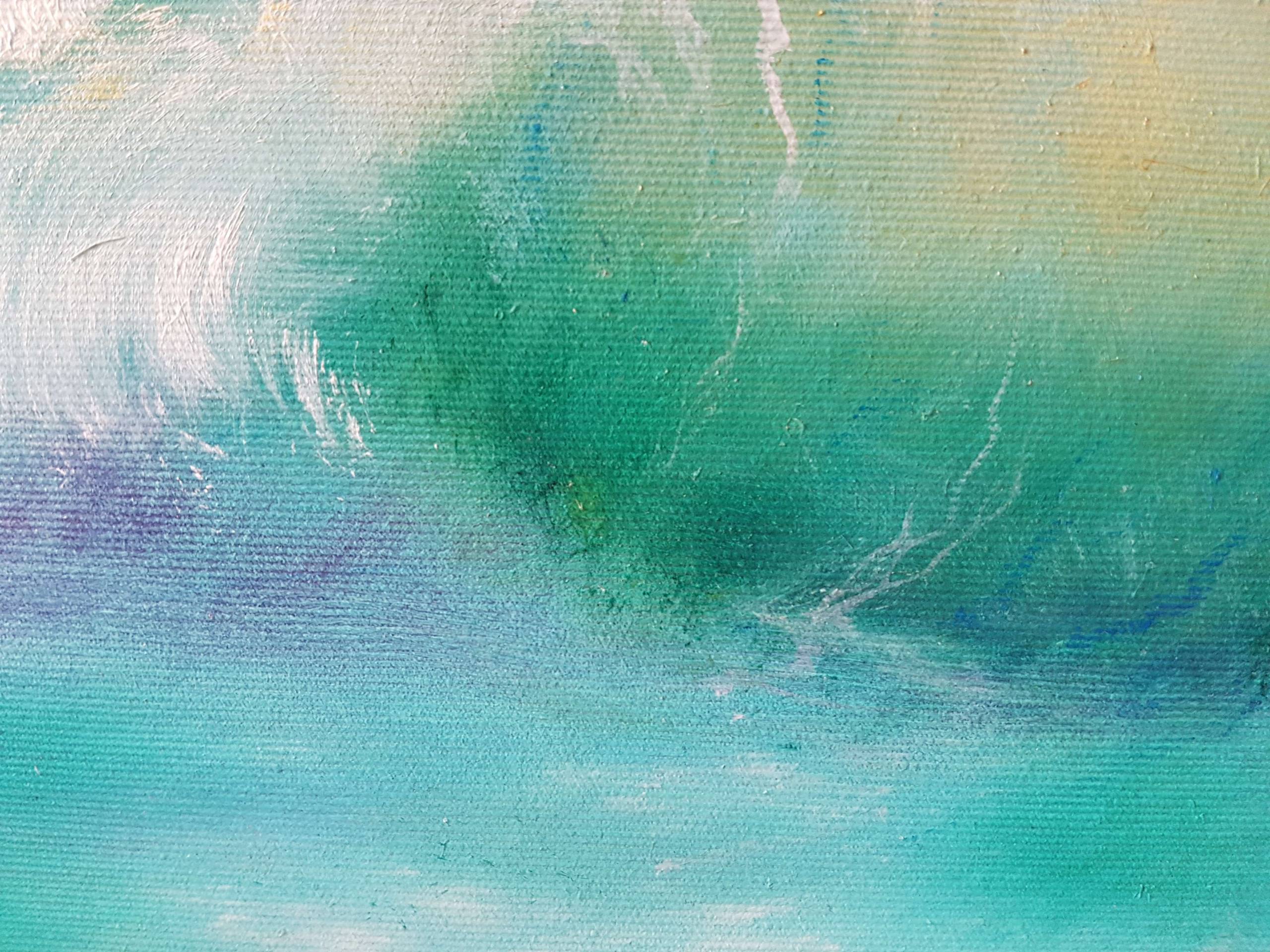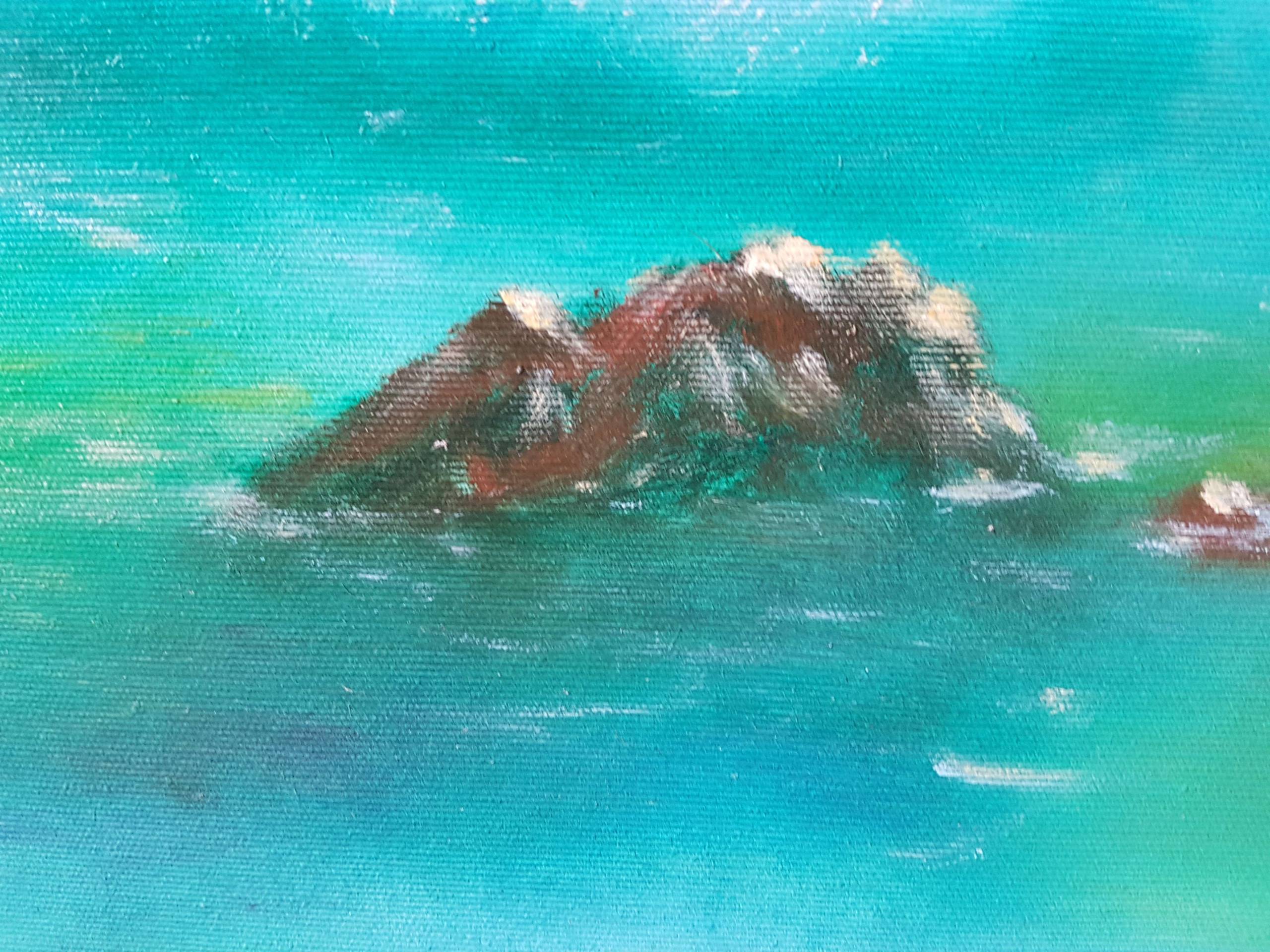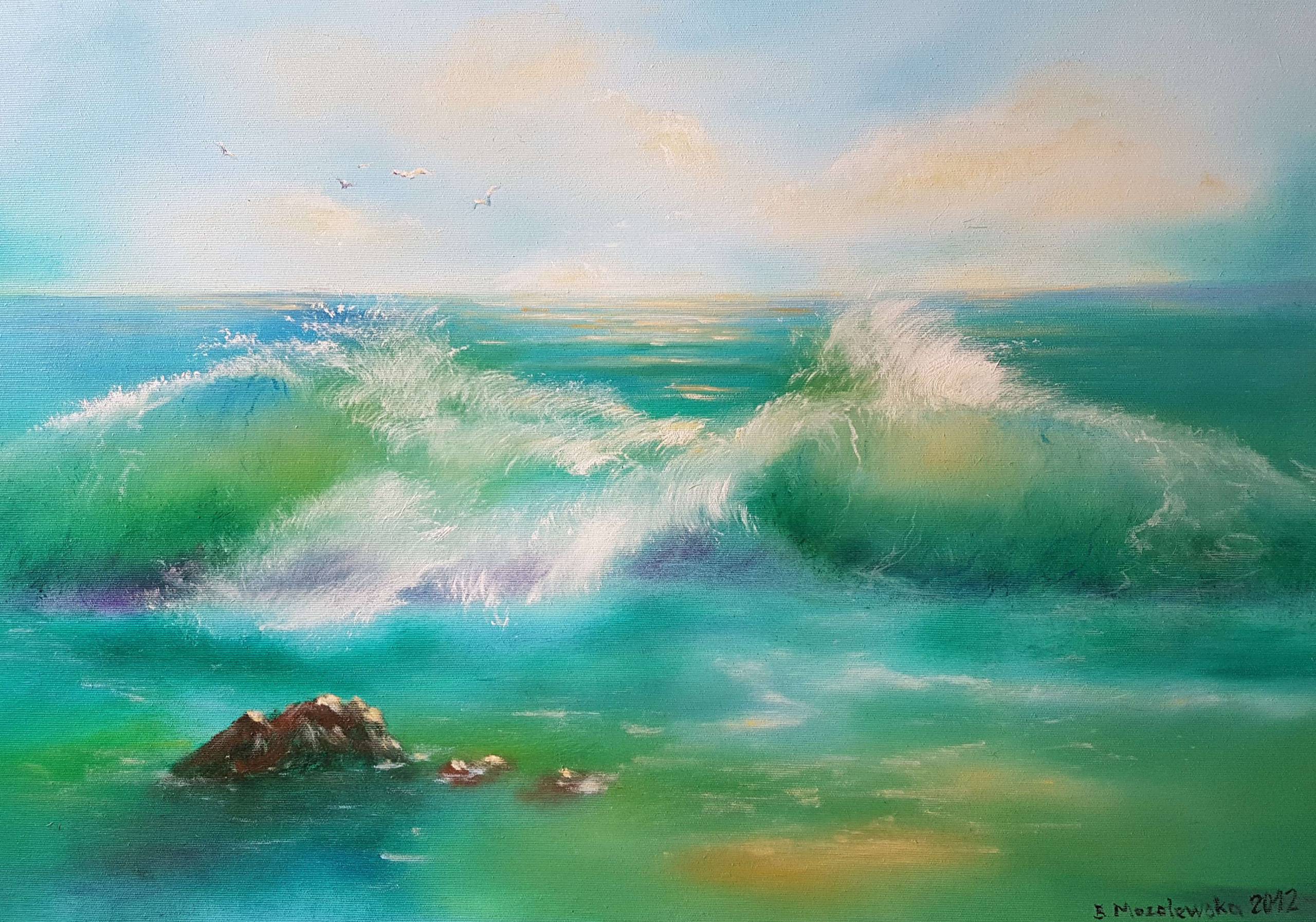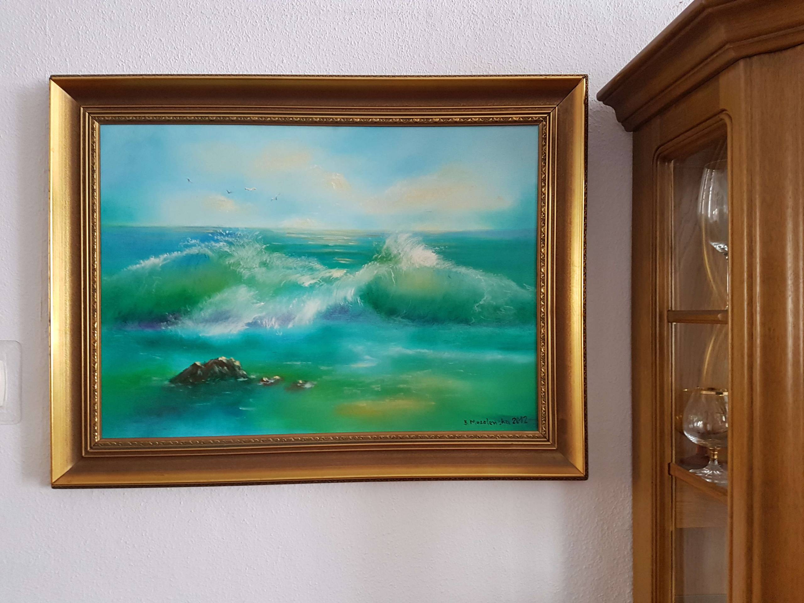 Obraz namalowany w 2012 roku. Przedstawia morze w słoneczny, ciepły dzień. Obraz oprawiony jest w starą drewnianą ramę.