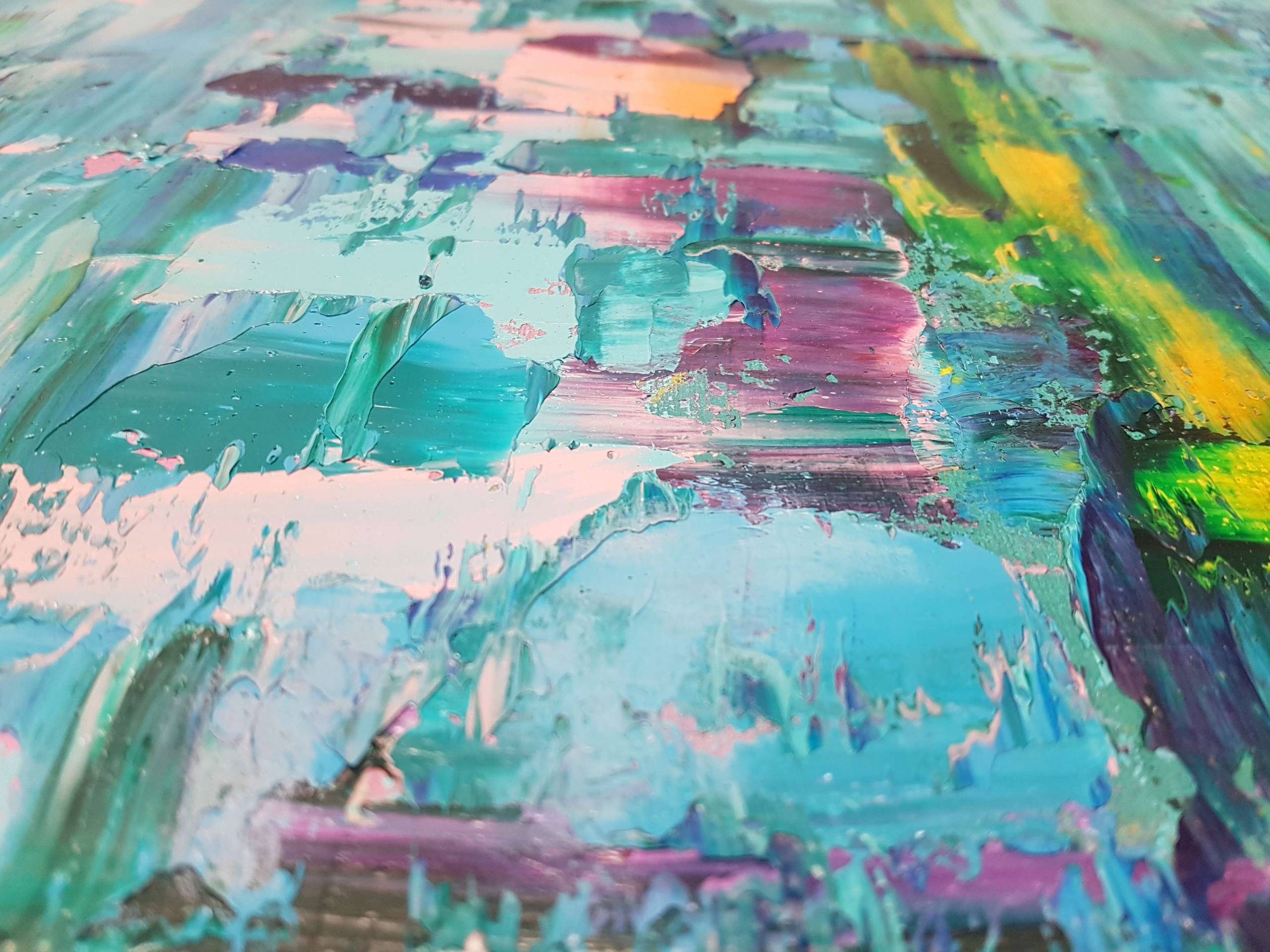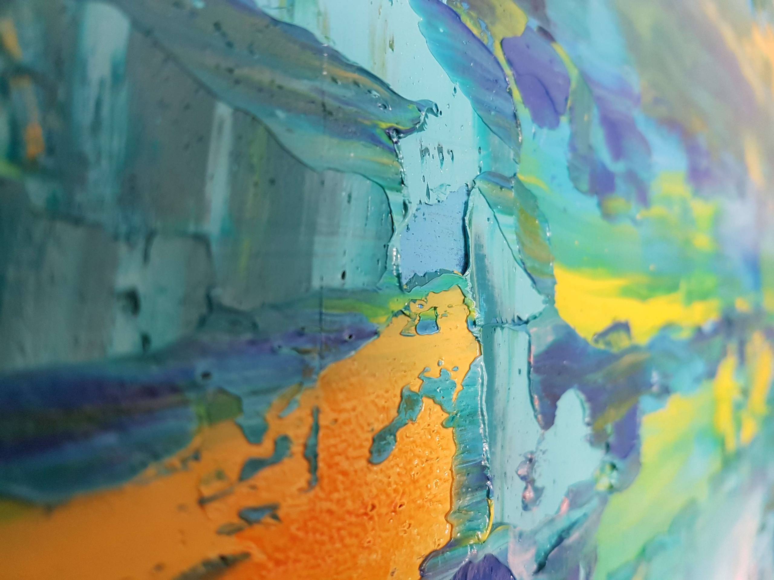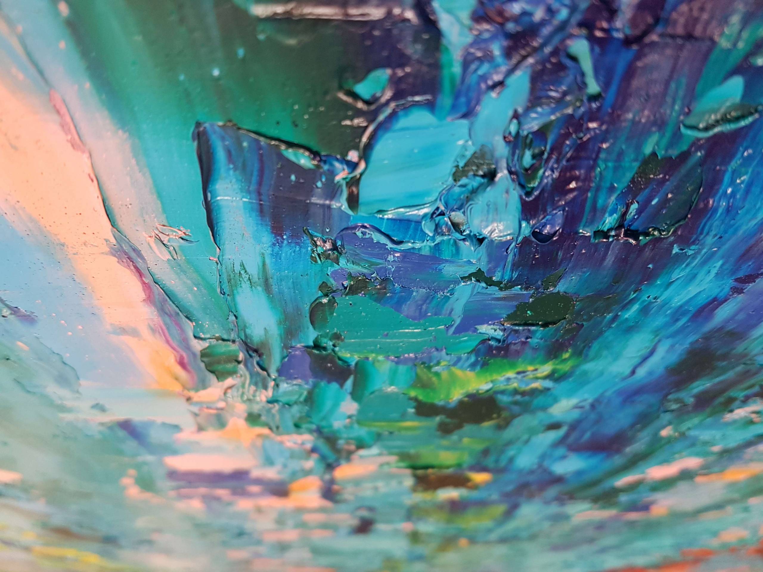 Obraz wprowadza w świat odbić świateł na wodzie w ciepłe popołudnie. Widoczna jest faktura grubych warstw farby olejnej.