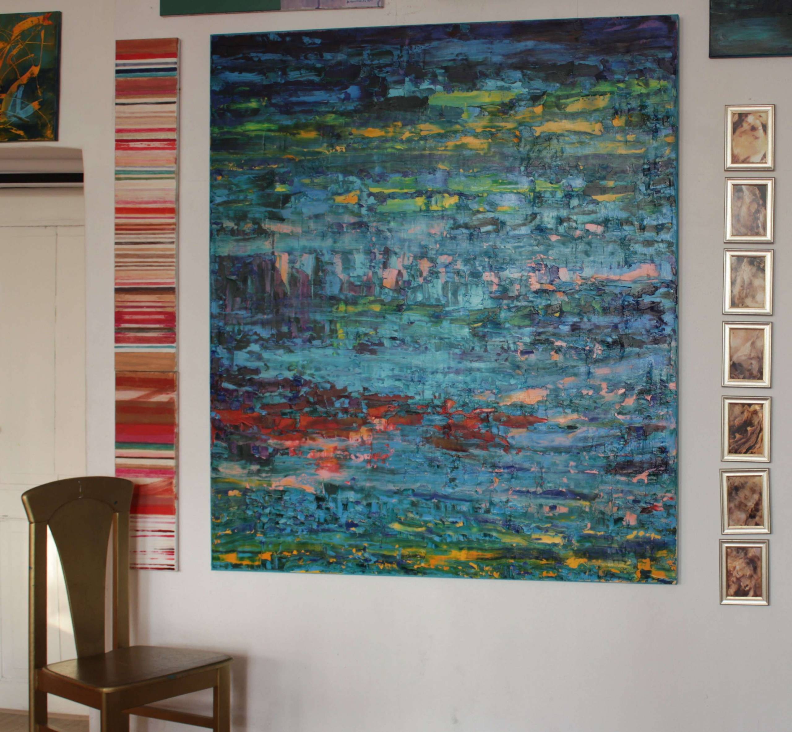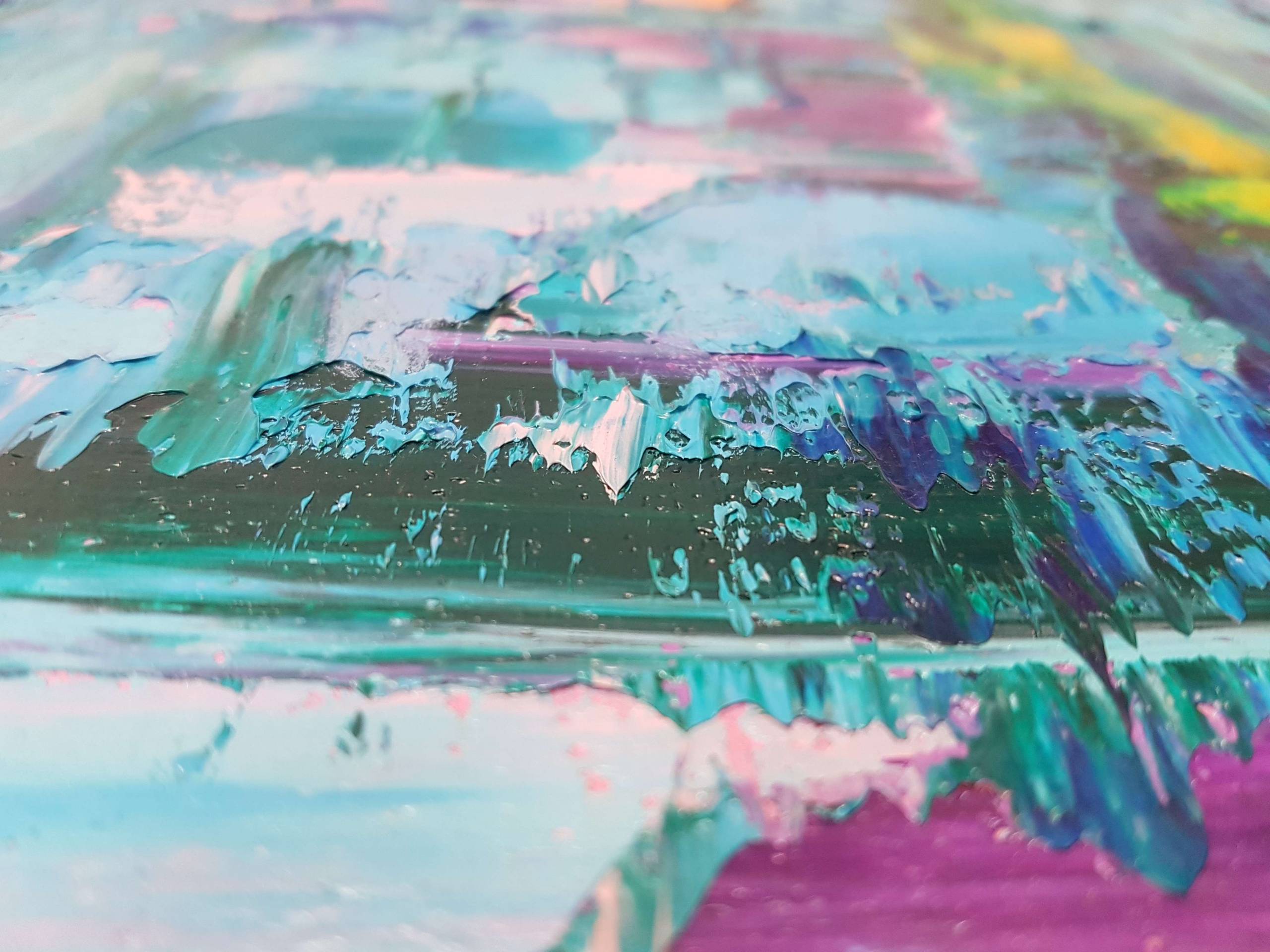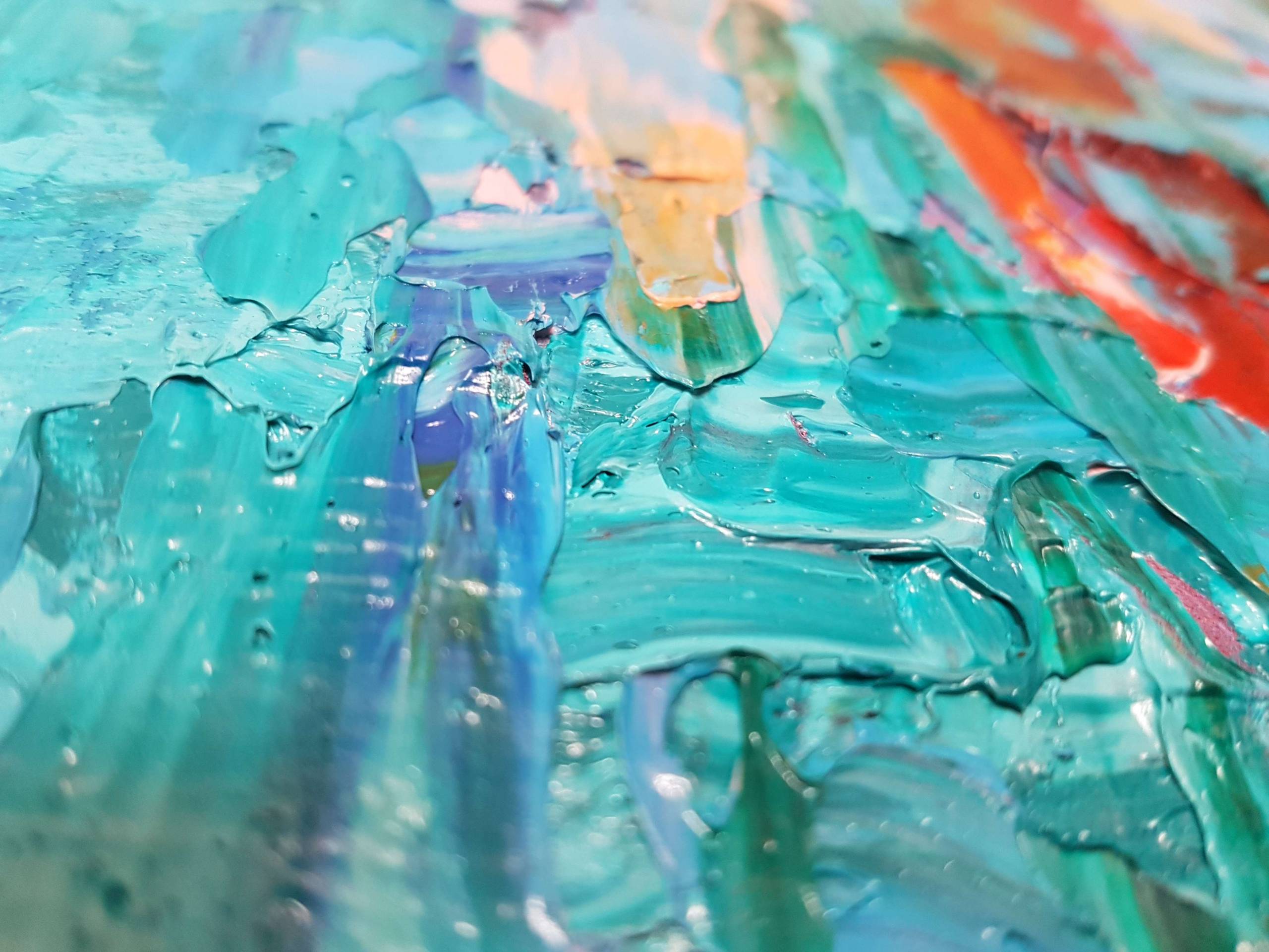 Obraz wprowadza w świat odbić świateł na wodzie w ciepłe popołudnie. Widoczna jest faktura grubych warstw farby olejnej.