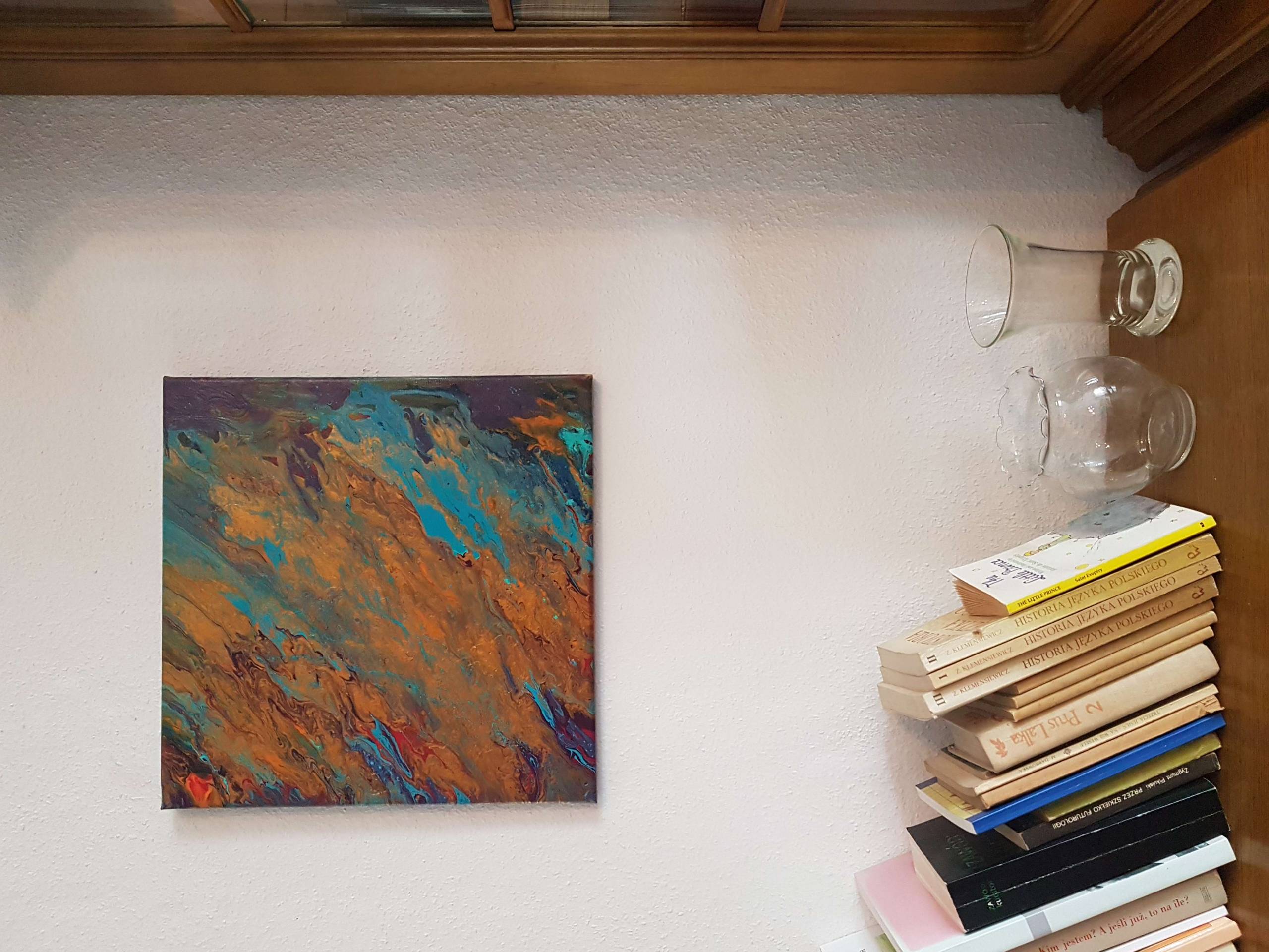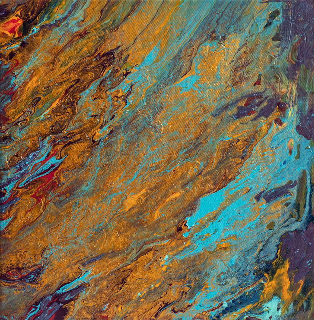 Pejzaż lądu widzianego z lotu ptaka. Widać na nim, jak woda zagarnia powierzchnię lądu. Zastosowałam tu złotą farbę. Obraz wprowadza widza w pozytywne emocje.