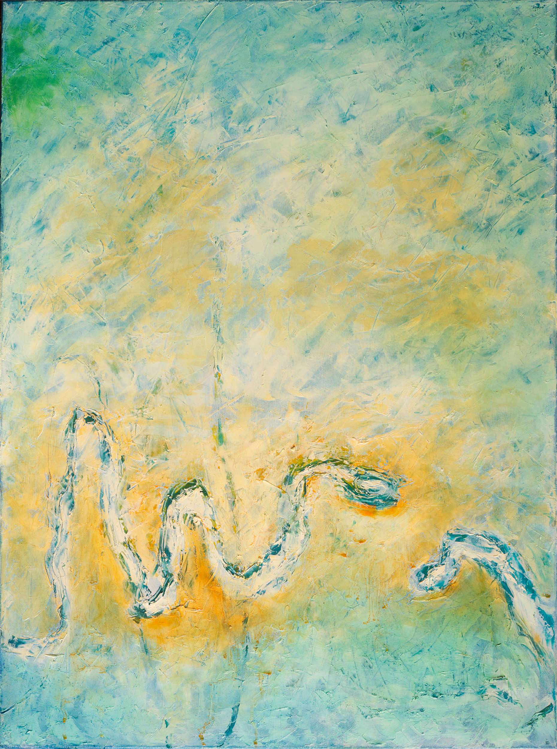 Obraz nawiązujący do historii Adama i Ewy, pokazanej w nowym kontekście. Namalowany grubą warstwą farby olejnej w pastelowych kolorach.