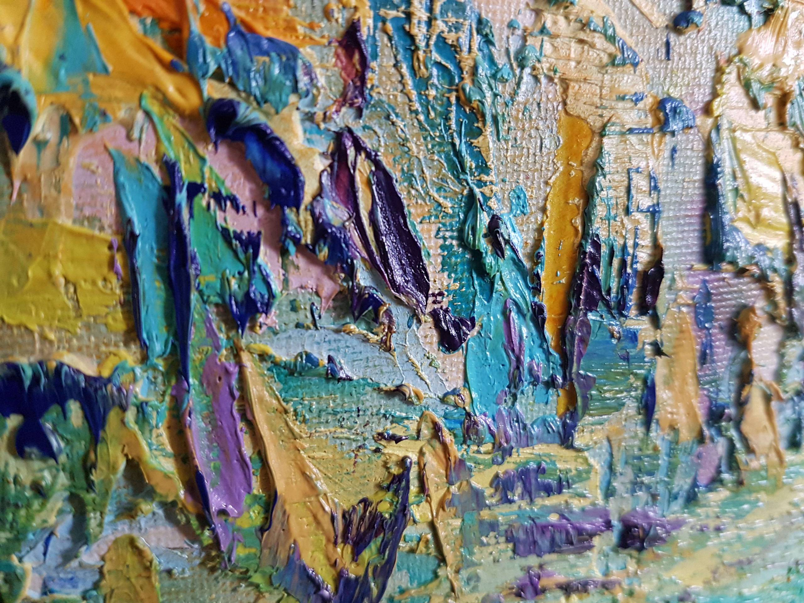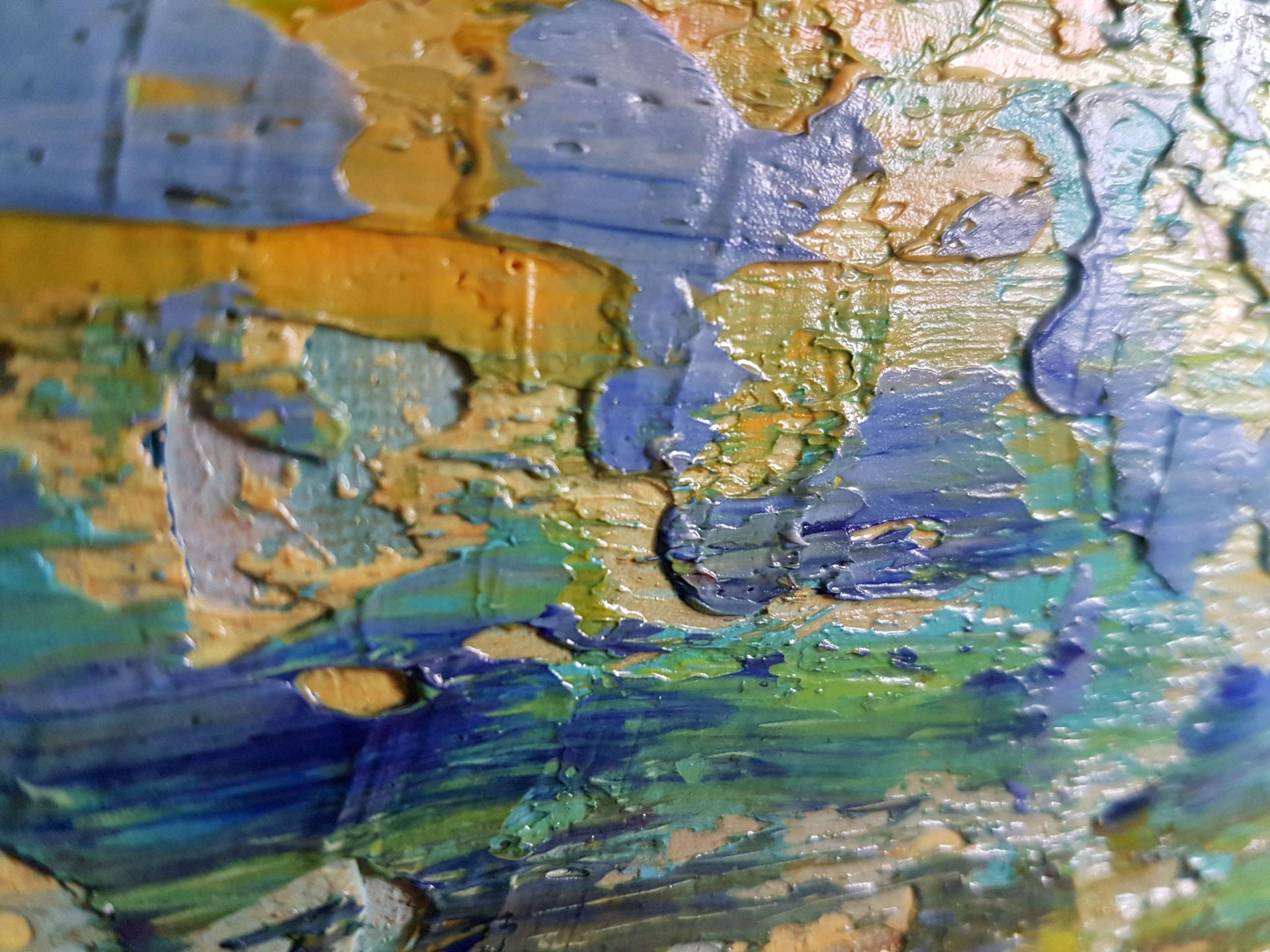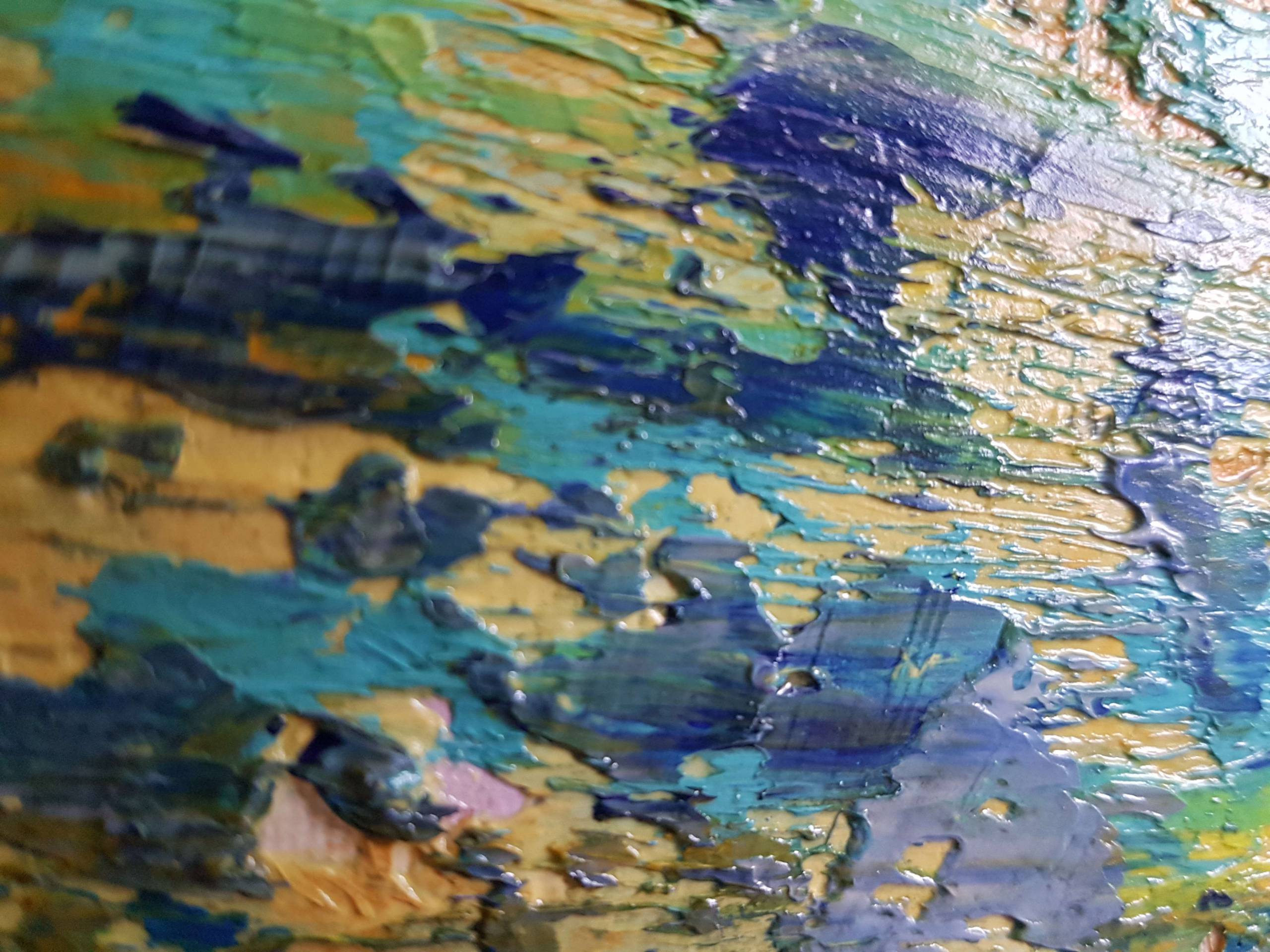Obraz namalowany w 2019 r. Obraz fakturalny, malowany szpachlą, grubą warstwą fabr olejnych. Wzbudza pozytywne emocje i daje dobrą energię.