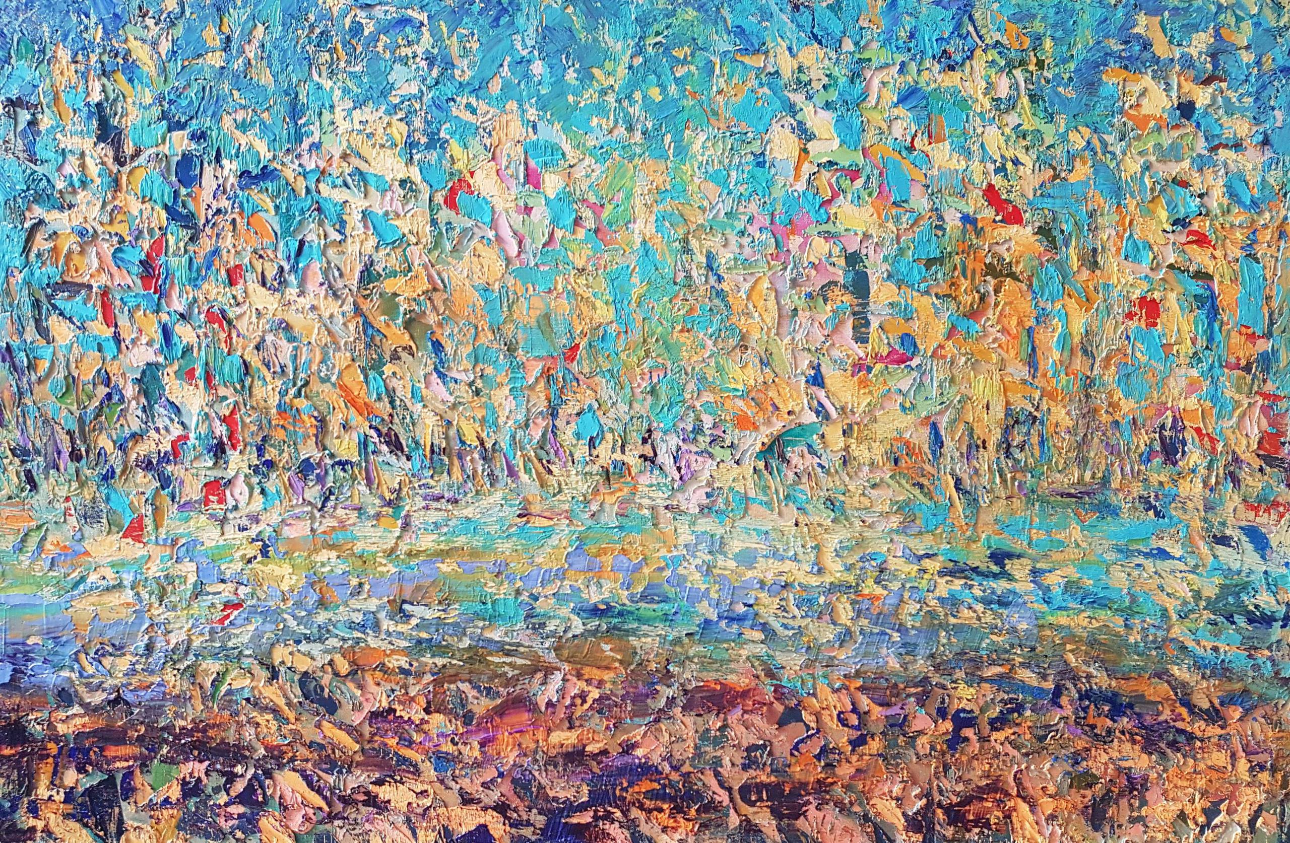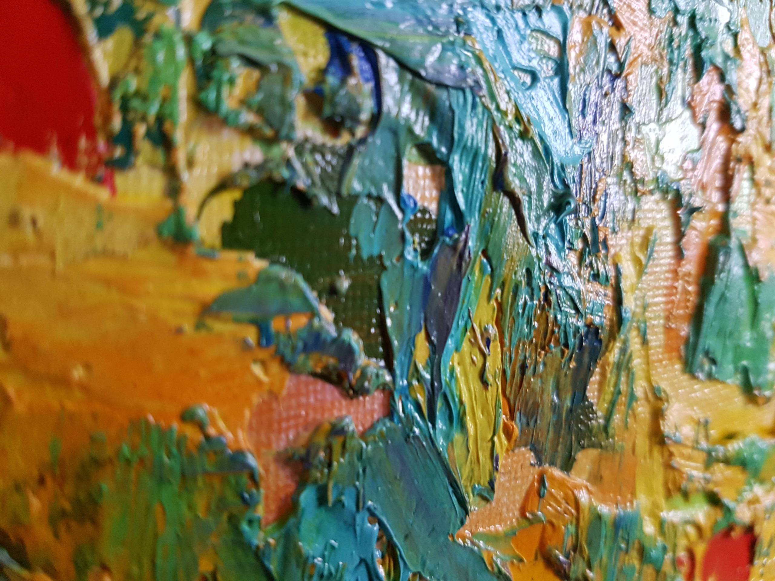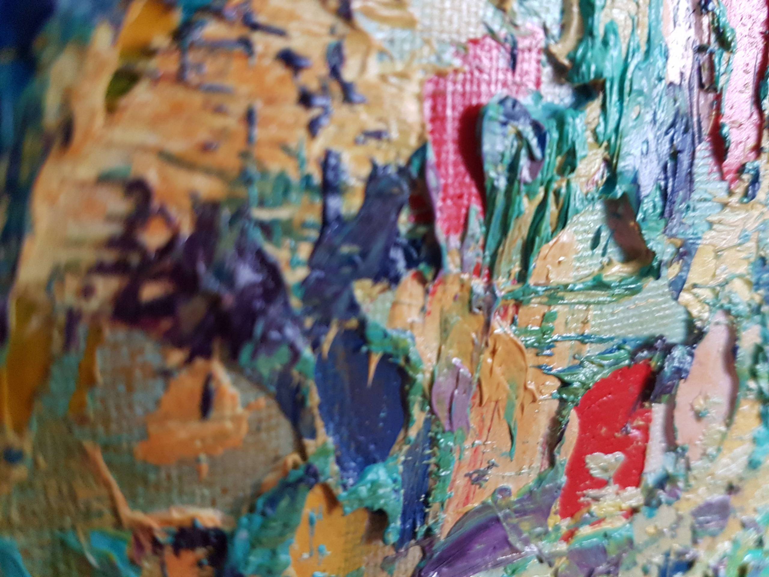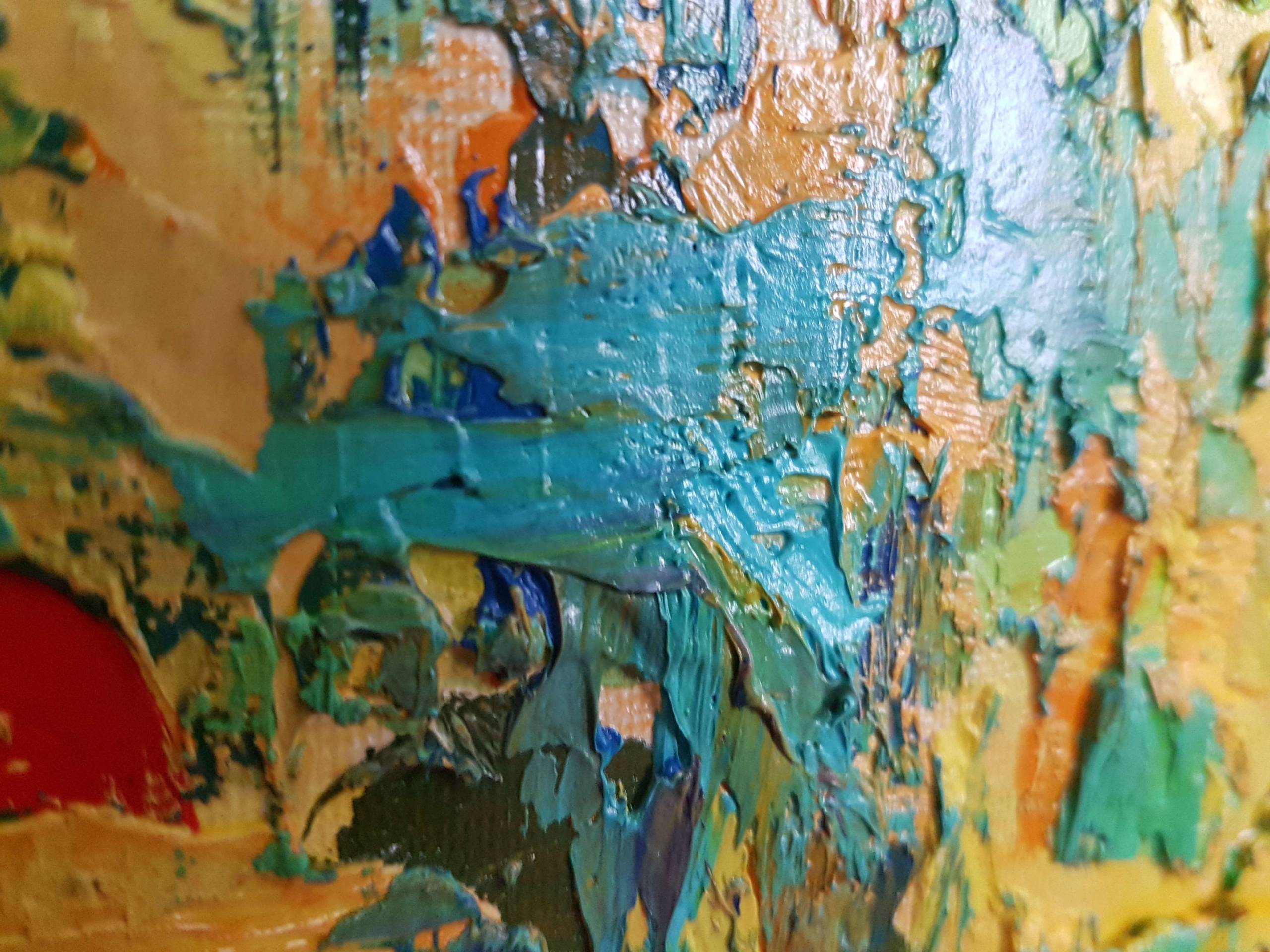 Obraz namalowany w 2019 r. Obraz fakturalny, malowany szpachlą, grubą warstwą fabr olejnych. Wzbudza pozytywne emocje i daje dobrą energię.