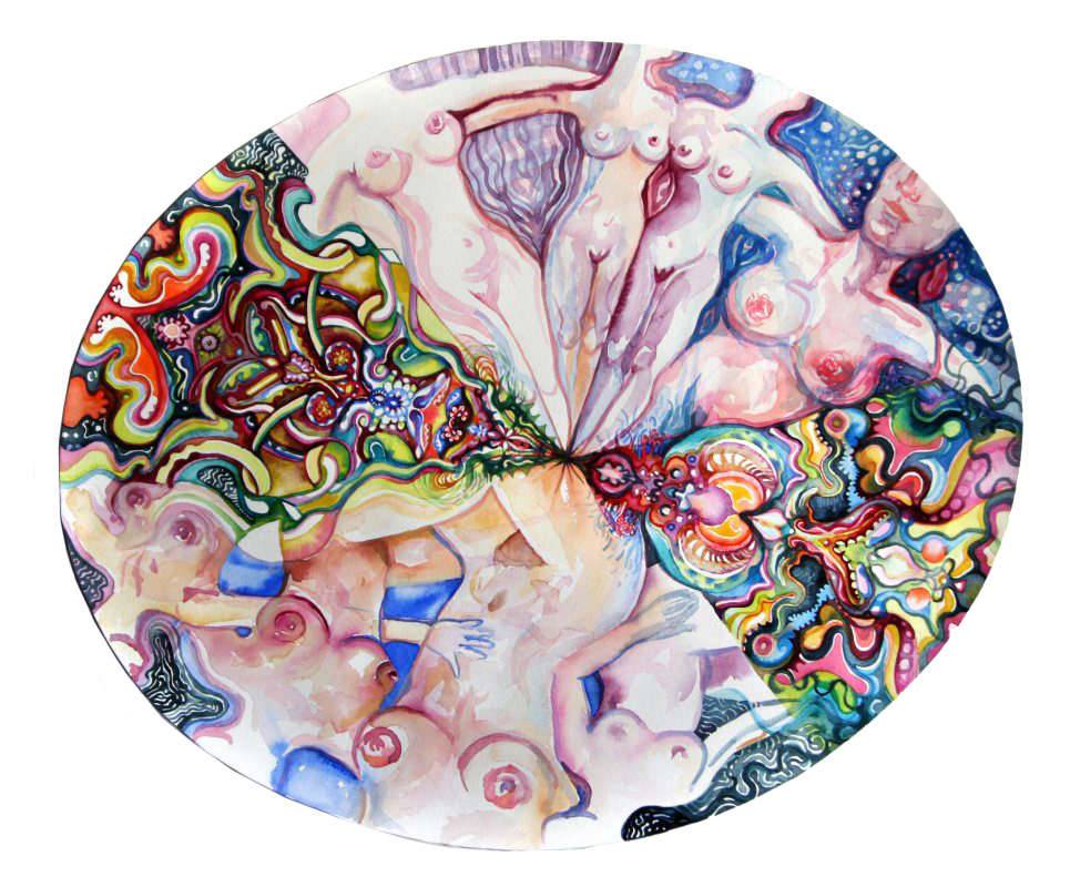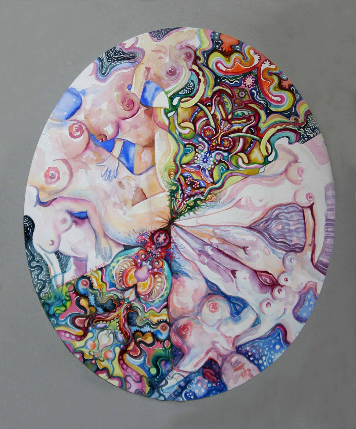 Kobiety o jakich nikt nie śnił, ukrywają się w gąszczu najbardziej niewyobrażalnych marzeń. Zasnąć raz i zobaczyć je, choć jedną. Akwarela naklejaona na tekturę, owalna 60 cm x 50 cm Sygnowana przez artystkę -Bożena Pilarczyk 2018r