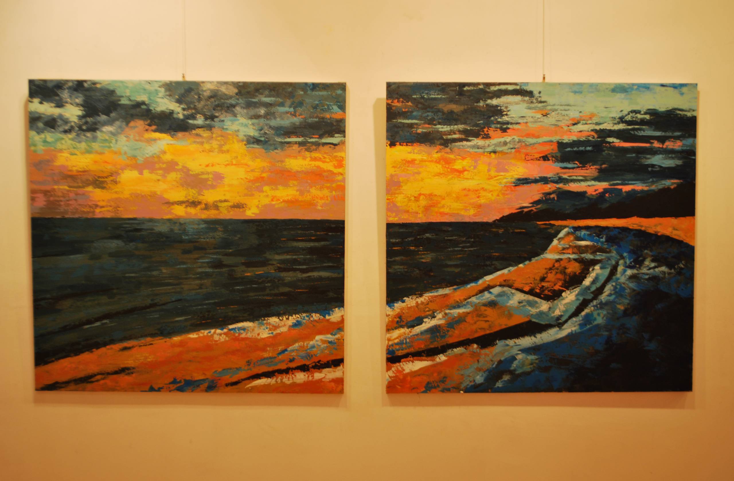 Obraz ten to prawdziwa eksplozja barw i emocji. Składa się z dwóch części, które idealnie komponują się ze sobą przez połączenie ciepłych i zimnych kolorów. Intensywne żółcie, pomarańcze i czerwienie sprawiają, że horyzont zdaje się płonąć, a niebo wygląda niemal jak płótno malowane płomieniami zachodu słońca. Z kolei granaty i błękity wprowadzają chłodną równowagę, przypominając o nadciągającej nocy. Kompozycja jest dynamiczna, pełna ruchu, jakby morze i niebo prowadziły nieustanny dialog. Efekt ten osiągnięto przez wykorzystanie techniki impasto, gdzie faktura i grubość farby dodają głębi. Styl jest nowoczesny, a może nawet trochę surrealistyczny, co sprawia, że widz czuje się przejęty i zaintrygowany. Kiedy patrzę na ten obraz, czuję nutkę nostalgii za wakacjami i letnimi wieczorami. Może nawet trochę odwagi, bo jak mówi taki jeden “Wow, but this sunset rocks". Już od pierwszego spojrzenia można poczuć powiew morskiej bryzy i słyszeć szum fal. Dzieło to niewątpliwie budzi emocje: radość, tęsknotę, a może i odrobinę zadumy. W sumie to wygląda jak dwie kartki z pamiętnika podróżnika, który zakochał się w pięknie natury.