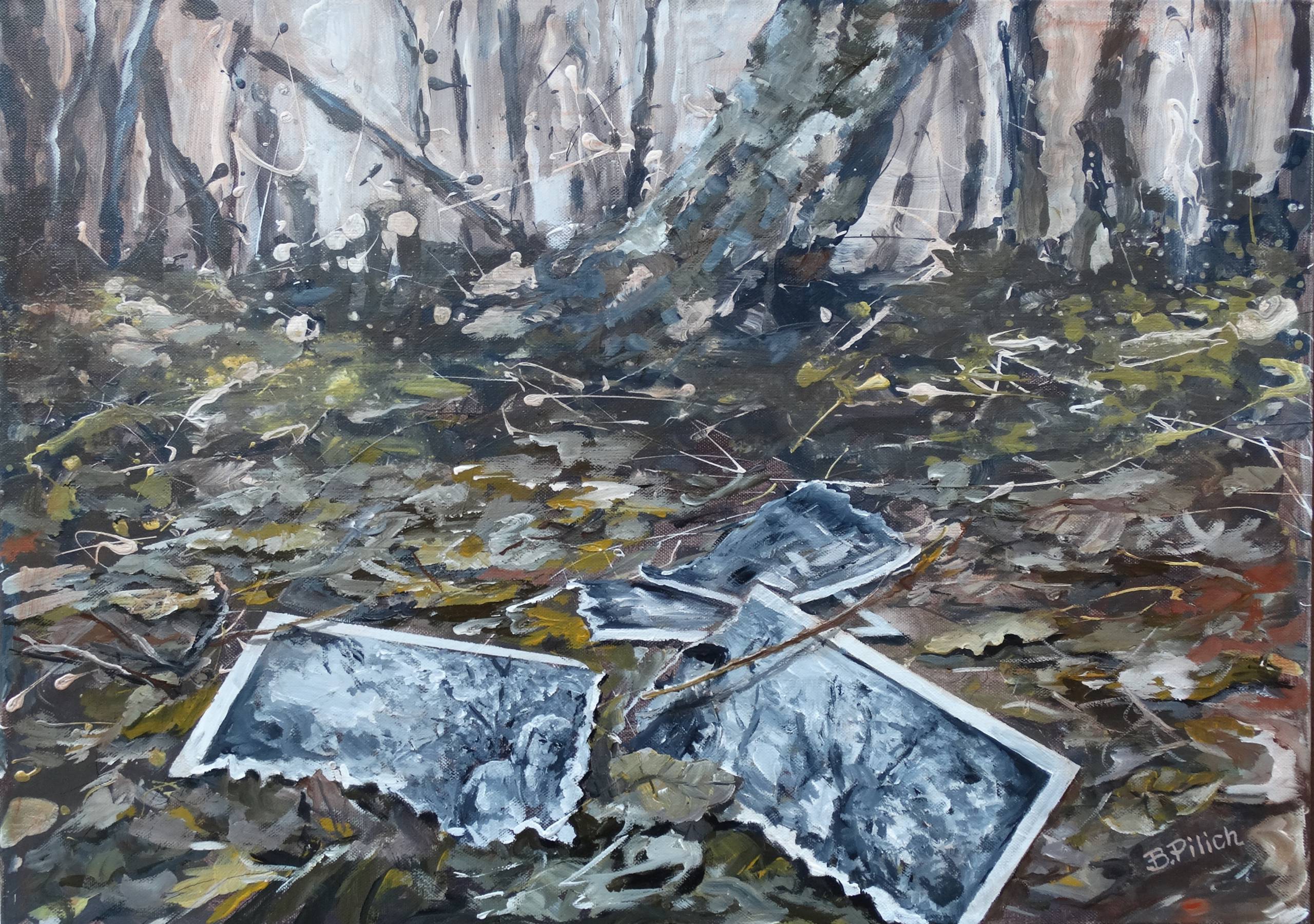 Obraz przedstawia tajemniczą scenerię lasu przepełnionego ciemnymi, ziemistymi barwami przerywanymi przez blade, ledwie widoczne pnie drzew. Kontrast między szarością a brązami tworzy głęboką, niemal melancholijną atmosferę. Na ziemi dostrzegamy rozrzucone fragmenty starych zdjęć, które przyciągają wzrok swoją nienaturalną bielą. To jak tajemniczy skrawek przeszłości zagubiony w małym zakątku natury. Styl artysty jest wyrazisty, wykorzystuje dynamiczne pociągnięcia pędzla, które przypominają opadające liście, niemal "splash" kolorów. Użycie technik impasto nadaje obrazowi teksturę i charakter. Te niedoskonale pokazane fotografie sugerują, że coś w tym lesie zostało zapomniane, jakby ktoś rzucił swoje wspomnienia na pastwę czasu. Obraz wzbudza emocje nostalgii i tajemnicy. Patrząc na niego, można poczuć niemal echo przeszłości, jakby szepczące "memory". Kojarzy mi się z opowieściami dziadków o zgubionych w lesie sekretach. Potrafi przyciągnąć uwagę i zaklina odbiorcę w swojej osobliwej aurze, zasiewając pytania o historii ukrytej na zaś. Nasunęła mi się myśl jak to mała tajemnica - takie coś jak w baśniach, kiedy dzieci w lesie szukały śladów.
