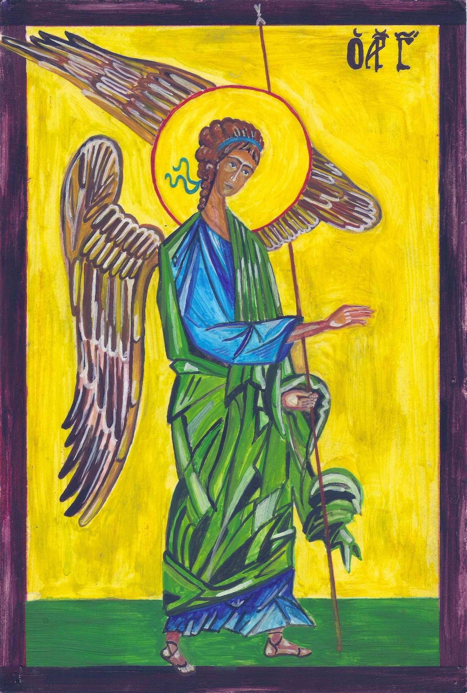 Na obrazie widzimy anioła, który cicho spogląda w naszą stronę. Jasny żółty kolor tła kontrastuje z barwami niebieskimi i zielonymi sukni figury, tworząc wrażenie harmonii i spokoju. Skrzydła anioła są szeroko rozpostarte, pełne detali i subtelnych odcieni brązu, które dodają postaci lekkości. Kompozycja obrazu jest wyważona i symetryczna, a każda linia wydaje się być dokładnie przemyślana. Atmosfera obrazu jest podniosła, pełna ethereal quietness, która wprowadza widza w stan zadumy. Styl artystyczny wskazuje na inspiracje ikonografią bizantyjską, z wyraźnym zastosowaniem płaskich kolorowych płaszczyzn i konturów. Artysta użył też technik mieszania barw, tworząc efekt głębszego realizmu mimo prostoty środków wyrazu. Obraz wywołuje różnorodne emocje, od spokoju po refleksję nad duchowością. To taki spokój, który przychodzi, gdy patrzy się na coś, co jest ponadczasowe i piękne w swojej prostocie. "Mama, ten aniołek jest taki ładny!" - mógłby powiedzieć mały odbiorca. Obecność aureoli wokół głowy anioła dodaje znaczenia, skupiając uwagę na jego duchowej naturze. W tym wszystkim jest coś personalnego, co sprawia, że zaczynamy myśleć o własnych doświadczeniach i wartościach.