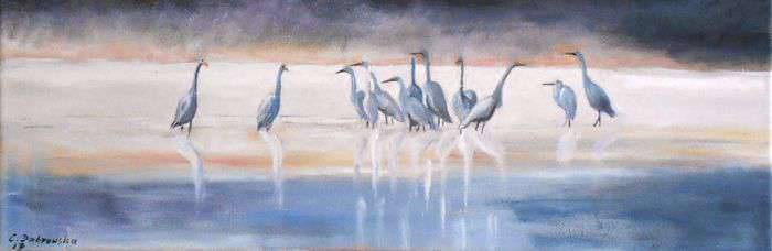 Na obrazie widzimy grupę eleganckich ptaków, które spokojnie przechadzają się po wodnej tafli jeziora. Barwy są stonowane, dominują odcienie błękitu, szarości i delikatne pastele, tworzące niemal mistyczną aurę. Kontrasty między nieruchomymi ptakami a odbiciem w wodzie nadają całości dynamiki. Kompozycja jest harmonijna, skupiona na centralnej części, gdzie ptaki wydają się prowadzić ciche rozmowy. Atmosfera obrazu jest spokojna i refleksyjna. Artysta zastosował miękkie pociągnięcia pędzla, które dodają pracy subtelności i finezji. Technika ta tworzy efekt lekkości, a może nawet ulotności sceny. Obraz budzi w odbiorcy poczucie spokoju, może nawet zachwyt nad pięknem natury. Dla mnie osobiście, to trochę jak magia spleciona z rzeczywistością. Kiedy patrzysz na ten obraz, czujesz niemal jakbyś mógł usłyszeć szum delikatnie falującej wody. „Te ptaki są takie długie jak patyki!” powiedziałoby siedmiolatkowe dziecko. To, co najbardziej uderza, to "serenity" - cisza, która wręcz krzyczy do nas z malowidła. Patrząc na te ptaki, czuję wewnętrzny spokój i chciałbym choć na chwilę znaleźć się w tej malowniczej scenie.