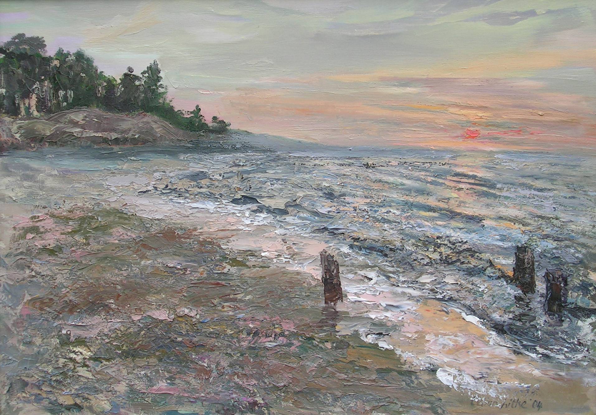 Na obrazie widzimy spokojne wybrzeże, gdzie morze subtelnie zlewa się z niebem na horyzoncie, tworząc harmonijną całość. Kolory są stonowane, dominują błękity, szarości i różany róż porannego brzasku. Artysta zastosował technikę impasto, co dodaje głębi i struktury, nadając wrażenie ruchu fal. Pędzel widoczny w grubo nałożonej farbie tworzy kontrasty między spokojną wodą a dynamicznymi chmurami. Nastrój obrazu emanuje ciszą i melancholią, jakby ktoś właśnie opuścił to miejsce, zostawiając za sobą spokojne echa chwil. Przywodzi na myśl poczucie ulotności chwili, tęsknoty za tym, co minione. Jest jak dream z dzieciństwa przywołujący wspomnienia o beztroskich wakacjach nad morzem. Emocjonalna reakcja odbiorcy może oscylować między ulotną radością a melancholią. Myślisz sobie: "Jak tam pięknie było". Linia brzegu oraz niewielkie elementy roślinności w tle dodają kompozycji równowagi. To obraz, przy którym chce się usiąść i zapomnieć o wszystkim.