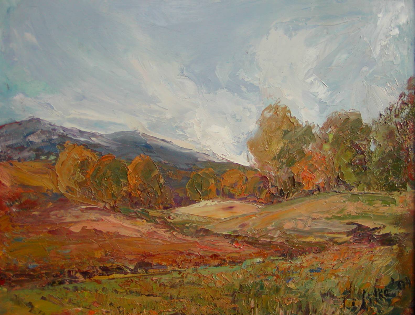Na obrazie widzimy jesienny pejzaż, pełen ciepłych odcieni brązu, złota i czerwieni. Drzewa, na wpół przysłonięte mgłą, rozciągają się wzdłuż horyzontu, tworząc falującą linię przeciwstawiającą się jasnym, niemal puchatym chmurom na niebie. Całość malowana szerokimi, energicznymi pociągnięciami pędzla, dodając poczucie ruchu i życia. Artysta zastosował technikę impasto, przez co farba wydaje się świeża i namacalna. Obraz emanuje atmosferą spokoju i nostalgii, jakby zapraszał do zanurzenia się w tej chwili ciszy przed szelestem liści. Patrząc na krajobraz, można poczuć lekki chłód wiatru i promienie zachodzącego słońca na twarzy. Hey, to jest takie magiczne! Może przywodzić na myśl spokojne chwile z dzieciństwa, kiedy biegało się po polach. Styl artystyczny jest trochę jak mieszanka realizmu z romantyzmem, tworząc mieszankę dream i rzeczywistości. Osobiście, ten obraz przypomina mi chwile, gdy czas płynie wolniej i można po prostu być. Czy to nie jest wspaniałe, jak sztuka potrafi przenieść cię w inne miejsce?