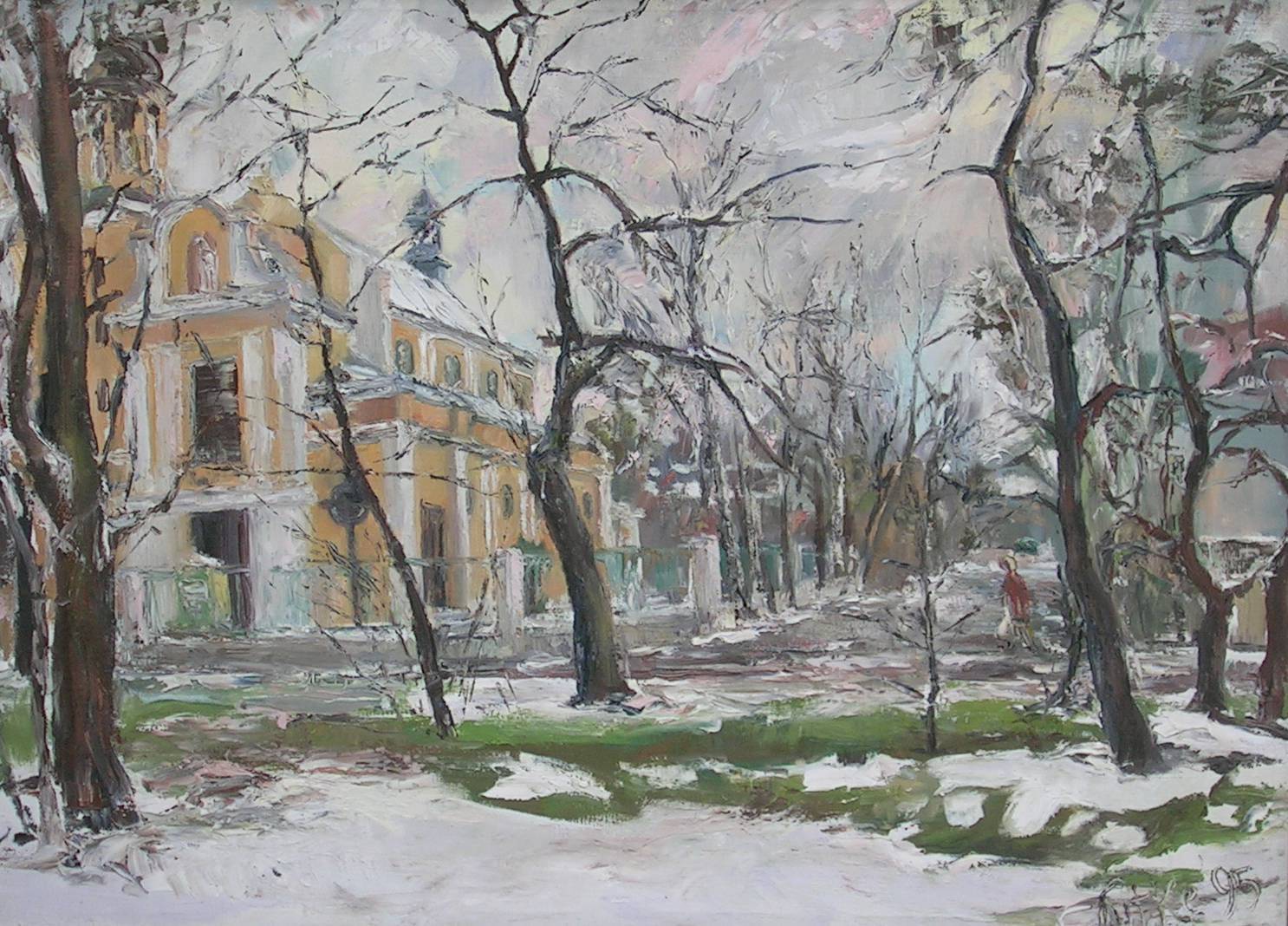 Obraz przedstawia zimowy krajobraz miejskiej uliczki, przy której stoi majestatyczna, żółta kamienica. Kolory są stonowane, z dominującymi odcieniami bieli, szarości i żółci, co nadaje całości spokojny, nieco melancholijny nastrój. Delikatne refleksy różu i zieleni przebijają przez chmury, dodając obrazowi odrobinę ciepła. Kompozycja jest dynamiczna, z gałęziami drzew tworzącymi wzory na tle zimowego nieba. Nastrój obrazu to mieszanka zimowej ciszy i nostalgii, jakby czas się zatrzymał, by uchwycić tę jedną chwilę. Styl artysty jest swobodny, można dostrzec szerokie, pewne pociągnięcia pędzla, które tworzą fakturę na powierzchni płótna. Technika impasto, z grubszymi warstwami farby, dodaje głębii przestrzeni. Te się te szczegóły: dają wrażenie rzeczywistego chłodu zimy i chrzęszczącego śniegu pod stopami. Emocje, jakie wywołuje ten obraz, to swoista nostalgia i spokój, ale też lekkie wyczekiwanie. A może to scena z bajki, gdzie zaraz pojawi się biały królik? Dziecko mogłoby powiedzieć: "To wygląda jak śnieżna kraina!" Osobiście czuje się tak, jakbym zaraz miał się tam przechadzać, zatopić w cieniu drzew. Te magiczne, almost enchanting, chwile spędzone w zimowym mieście, kiedy czas zwalnia i człowiek ma chwilę jedynie dla siebie.