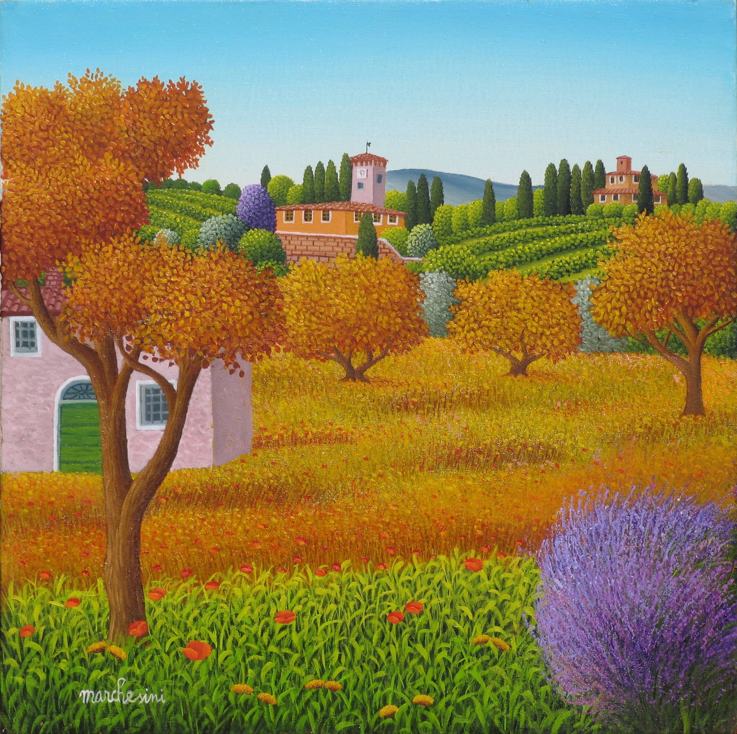 Obraz przedstawia idylliczny krajobraz przywodzący na myśl złotą jesień. Dominują tu ciepłe odcienie, takie jak pomarańczowy i złoty, kontrastujące z soczystą zielenią drzew i traw. Niebo jest czyste, błękitne, podkreślając spokojną atmosferę tej scenerii. Główna część obrazu to rozległa łąka pokryta kwitnącymi kwiatami, a na jej tle malują się urocze domki z charakterystycznymi czerwonymi dachami. Kompozycja jest harmonijna, przywodząc na myśl wiejską utopię, gdzie życie toczy się wolno, a czas zdaje się zatrzymać. Artystyczny styl obrazu jest dość realistyczny, ale z nutką sennych marzeń. Artysta wykorzystał technikę delikatnego impasto, aby nadać kształtom i barwom teksturalną głębię. Drzewa są pełne drobnych, niemalże perfekcyjnych liści, co nadaje im realistycznego wyglądu, a zarazem bajkową aurę. Obraz może wywoływać uczucia spokoju, nostalgii, a nawet marzenia o wiejskiej ucieczce. Można niemal poczuć zapach lawendy i świeżo skoszonej trawy. Jakby jeden znajomy voice zawołał gdzieś z daleka. Patrząc na ten obraz, można mieć ochotę usiąść gdzieś na trawie i po prostu wpatrywać się w horyzont. Wyobraźnia zaczyna bawić się widokiem i mam wrażenie, że nagle wszystko staje się "magiczne". Według mnie, artysta uchwycił esencję spokojnego piękna. Pewnie chciałbym tam pojechać i pobawić się z takimi kolorowymi drzewami. To jest obraz, który naprawdę zapiera dech w piersiach i zachęca do chwili zadumy nad prostotą życia. Co za widok!