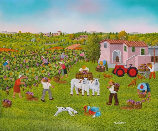 Na obrazie widzimy idylliczny krajobraz wiejski, tętniący życiem i kolorem. Przeważają tu soczyste zielenie, ciepłe odcienie czerwieni i różu, a także błękitne niebo pełne miękkiego światła. Kształty są wyraziste, a kompozycja zorganizowana w harmonijny sposób, tworząc uczucie spokoju i szczęścia. Na pierwszym planie znajduje się grupa ludzi zbierających winogrona, uśmiechnięci i pochłonięci swoją pracą. Towarzyszą im konie ciągnące wozy oraz pies żywiołowo biegający między nimi. Obraz emanuje nostalgią za prostszymi czasami i wzbudza wrażenie ciepła domowego ogniska. Artysta użył techniki malarstwa naiwniego, co dodaje całości pewnego uroku i childlike innocence. Można poczuć zapach pola i usłyszeć śmiech ludzi. Styl jest pełen szczegółów, co sprawia, że widz może długo wpatrywać się w obraz i za każdym razem odkrywać coś nowego. Patrząc na tę scenę, można poczuć wewnętrzny spokój i radość z prostych chwil życia. Ten obraz to prawdziwy "escape" od miejskiego zgiełku. A teraz, spójrzmy przez chwilę oczami dziecka: "Patrz, piesek biega i jest bardzo szczęśliwy!" Zdecydowanie, jest w tym coś magicznego, coś, co przyciąga i nie pozwala odejść zbyt szybko.