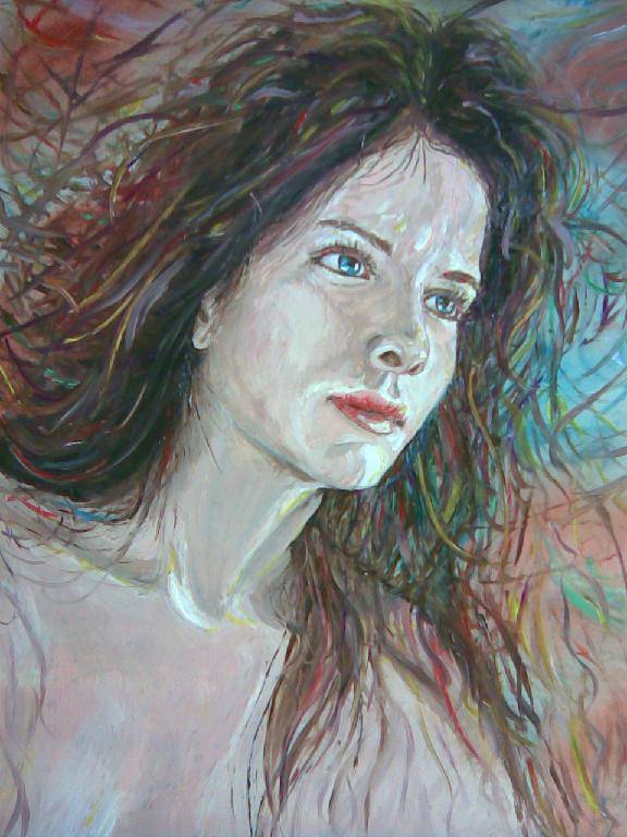 Na obrazie widzimy postać kobiety z intensywnym spojrzeniem, jakby zapatrzoną w dal. Kolory są subtelne, dominują odcienie brązu i delikatne błękity, które przeplatają się z ciemniejszymi tonami. Włosy kobiety wirują wokół jej twarzy, tworząc chaotyczną, ale wciągającą kompozycję. Ta dynamiczność nadaje obrazowi pewną energię, niemal jakby był alive. Artysta zastosował techniki impasto, co widać w warstwach farby, które tworzą fakturę pełną głębi. Patrząc na jej twarz, można poczuć spokój i jednocześnie napięcie. Może to nutka tęsknoty, może chwila zadumy? To jak patrzenie na morze pełne nieodgadnionych tajemnic. Obraz wydaje się pytać nas, co kryje się za tym spokojnym spojrzeniem. Krótkie zdania połączone z długimi sprawiają, że tekst płynie, jakby prowadził nas przez wizualną przygodę. Hej, mamo, ta pani jest naprawdę ładna! Pociągnięcia pędzla są wyraziste, świadczą o pewnej intensywności procesji twórczej. Nastrój obrazu jest dość refleksyjny. Co siedzi w głowie tej kobiety? Każdy może mieć inne odczucia, ale na pewno trudno przejść obok obojętnie.