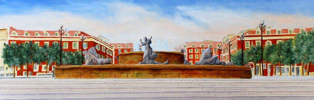 Obraz przedstawia żywą miejską scenę z fontanną na pierwszym planie, otoczoną budynkami w ciepłych ceglanych odcieniach. W tle rozciąga się niebo w jasnych błękitach z delikatnymi białymi chmurami, które dodają głębi i przestrzeni. Kompozycja jest harmonijna, a centralna fontanna z dynamicznymi postaciami przyciąga wzrok. Kolory są wyraziste, ale zrównoważone, tworząc wrażenie spokojnego poranka w mieście. Patrzysz i czujesz, jakbyś tam był, słysząc szum wody i gwar przechodniów. Artysta użył techniki malarstwa olejnego, co daje obrazowi miękkość i subtelność, a jednocześnie mocne akcenty kolorystyczne. Czy styl jest bardziej realistyczny czy impresjonistyczny? Trudno powiedzieć na pierwszy rzut oka. Wydaje się, że artysta chciał uchwycić chwilę codziennego życia, pokazując piękno w niewielkich szczegółach. Wydaje mi się, że obraz wywołuje poczucie nostalgii, za czymś prostym i znajomym. Ktoś mógłby powiedzieć, że "it feels just like home". Patrząc na obraz, zaczynasz rozmyślać o własnych spacerach po mieście, a wspomnienia same napływają do głowy. 7-latek powiedziałby pewnie: "Mam ochotę wskoczyć do tej fontanny!" Obraz nasyca odbiorcę mieszanką spokoju i radości z miejskiego życia.