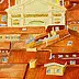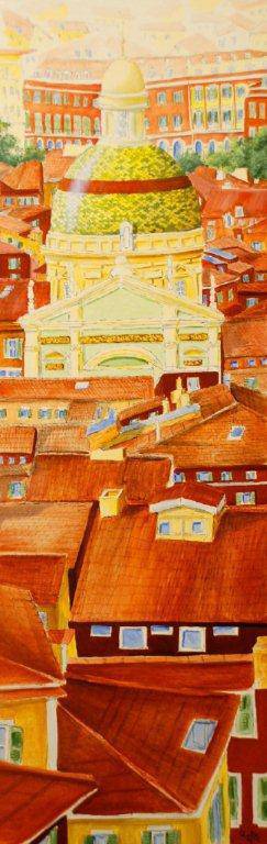 Obraz przedstawia panoramiczny widok miejskiej scenerii z dominującym budynkiem w centrum. Kolory to intensywne czerwienie i złociste odcienie, które tworzą cieplejszy nastrój. Dachy budynków są ceglaste, nadając im cozy charakter. Kształty są geometryczne, niczym puzzle, a kompozycja jest zdominowana przez centralnie usytuowaną kopułę. Atmosfera tego obrazu przypomina idylliczny, leniwy popołudnie w słonecznym mieście. Można prawie poczuć, jak słońce ogrzewa twarz. Styl artystyczny? Wygląda na impresjonistyczny, może nieco surrealistyczny, z delikatnymi pociągnięciami pędzla. Technika jest płynna, kolory mieszają się ze sobą, tworząc ciekawe efekty świetlne. Artysta użył gry światła, aby podkreślić głębię i wysokość konstrukcji. Obraz może wywoływać uczucia nostalgii lub marzenia o podróżach. Dziecko powiedziałoby: "Domki wyglądają jak z bajki!". To miejsce, gdzie chciałoby się pobiegać po dachach. Całość sprawia, że czujesz się jak w filmie, "just like a movie". Obraz jest wyrazisty, pełen życia, może nawet chaosu, ale takiego, który czyni go wyjątkowym. To dzieło, które można podziwiać w nieskończoność.