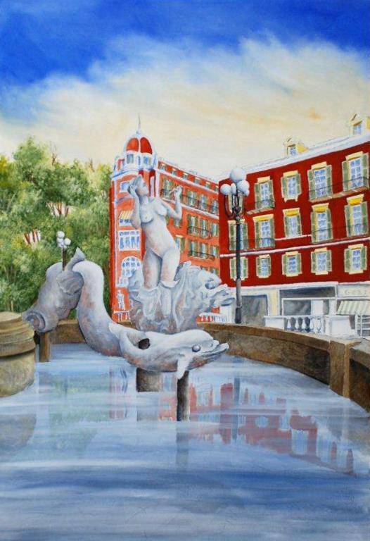 Na obrazie dominuje urokliwa scena miejskiego placu z fontanną na pierwszym planie. Woda w fontannie jest spokojna, lśniąca, odbija błękitne niebo i głęboki czerwony kolor kamienic w tle. Rzeźba przedstawia mitologiczne stworzenia, wyrzeźbione z białego kamienia, może trochę surrealistycznie. Nad wszystkim góruje jasne, niebieskie niebo, które wydaje się nieskończone. Atmosfera jest idylliczna, przypomina letnie popołudnie, gdy czas zwalnia. Styl artysty przypomina realizm z odrobiną impresjonizmu, z delikatnymi pociągnięciami pędzla tworzącymi miękkie przejścia kolorów. Patrząc na to dzieło, można poczuć spokój i harmonię, jakby wszystko było na swoim miejscu. Może nawet lekką tęsknotę za tamtym czasem, gdy życie toczy się na zwolnionych obrotach. Siedzę i myślę "czy chciałbym tam być?". Oczywiście! I muszę przyznać, że ten widok ma w sobie coś magicznego. It's truly captivating. A może to tylko moja wyobraźnia. Kto nie chciałby pobiec w te cudowne miejsca? Nawet dziecko zauważy, że wszystko jest takie piękne. Woda pluska, a w oddali szumi miasto. Mamy tu prawie jak w bajce, a może nawet lepiej.