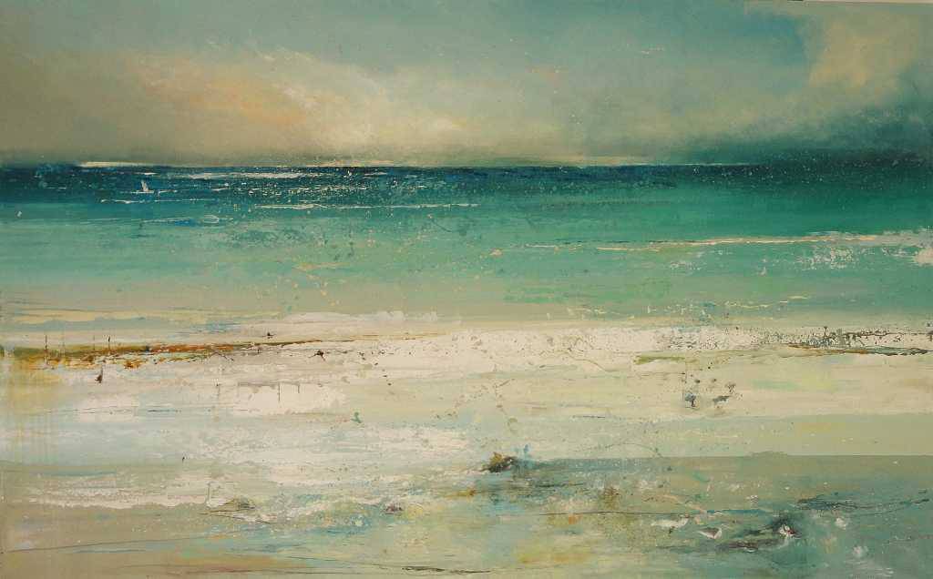 Obraz przedstawia spokojne morze. Kolory to chłodne błękity i turkusy, które mieszają się z bielą i kremem plaży. Horyzont zlewa się z niebem, tworząc poczucie nieskończoności. Kompozycja jest prosta, ale jednocześnie złożona w swojej prostocie. Atmosfera jest uspokajająca, niemal medytacyjna. Można poczuć delikatny szum fal i zapach soli w powietrzu. Styl jest nieco abstrakcyjny, artysta zastosował technikę impasto, pozostawiając widoczne pociągnięcia pędzla. Obraz wywołuje poczucie tęsknoty za beztroskimi dniami na plaży. "To wygląda jak miejsce, gdzie bawiłam się piaskiem!" – powiedziałoby dziecko. Użycie techniki impasto sprawia, że obraz ma teksturę przypominającą tekstylną powierzchnię. Możesz wyobrazić sobie, że zanurzasz stopy w ciepłym piasku. Dla mnie, this painting is a portal do marzeń o wakacjach. Kiedy na niego patrzę, czuję się zrelaksowany i odcięty od codziennych trosk. To jak mała, prywatna oaza spokoju.