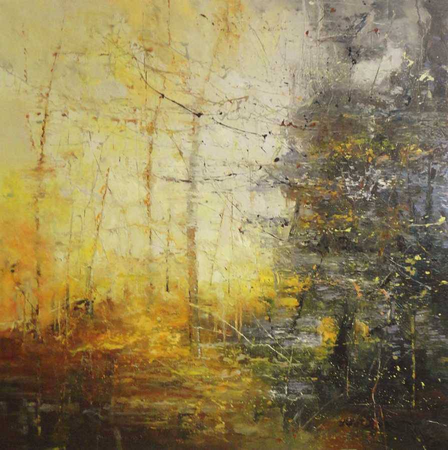 Oto obraz, który przyciąga wzrok swoją złożonością. Dominują na nim odcienie żółci i szarości, tworząc kontrast między ciepłymi i chłodnymi tonacjami. Kształty są rozmyte, niemalże abstrakcyjne, przypominające fragmenty lasu skąpanego w świetle poranka. Kompozycja sprawia wrażenie ruchu, jakby wiatr igrał sobie z liśćmi. Atmosfera obrazu jest niezwykle melancholijna. Jest w tym jakiś spokój, ale i nuta tajemnicy. To dzieło pachnie jesienią, tym momentem zawieszenia między życiem a snem. Czy tylko ja tak to widzę? Nie wiem, ale czuję się jak dziecko odkrywające ukryte światy za oknem. Artysta zastosował technikę impresjonistyczną, łącząc szybkie, zamaszyste pociągnięcia pędzlem z subtelnymi przejściami kolorów. Widoczna jest tu pewna niedbałość, jakby celowe pozostawienie przestrzeni na interpretację widza. Efektem jest iluzja głębi, która zaprasza do zagłębienia się w detale. Wow, to prawdziwa uczta dla oczu. Patrząc na ten obraz, można poczuć nostalgiczne emocje. Przypomina o przemijającym czasie, o chwilach ulotnych jak spadające liście. Może i Ty, oglądając to dzieło, poczujesz ciepło i chłód jednocześnie? A może przypomni Ci się ulubiona bajka z dzieciństwa. What a sight to behold. Pisząc to, zastanawiam się, co kryje się za tym rozmazanym pejzażem. Cóż, może zostawię to Waszej wyobraźni.