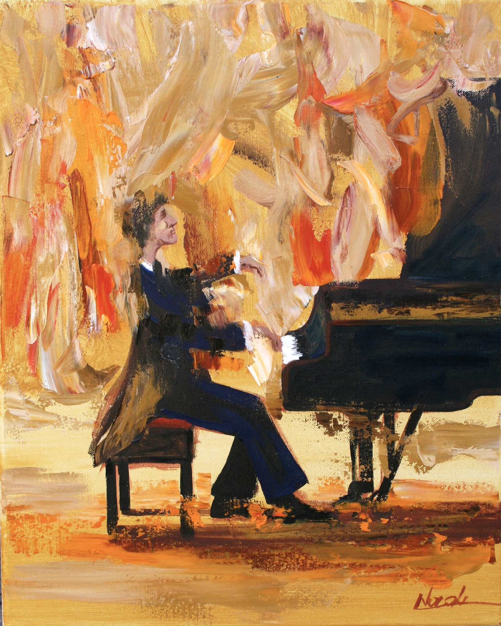 Na obrazie dominują ciepłe odcienie złota i pomarańczu, które wirują niczym płomienie wokół postaci pianisty. Jego sylwetka zdaje się wtapiać w muzyczny wir. Kompozycja jest dynamiczna; artysta uchwycił moment twórczej ekstazy, gdy dźwięki zdają się materializować w powietrzu. Pociągnięcia pędzla są swobodne, pełne ekspresji, a kolory energiczne. Atmosfera obrazu jest pełna pasji i dynamiki. Widz może niemal usłyszeć melodię wydobywającą się z fortepianu. Styl artystyczny jest abstrakcyjny, z silnym naciskiem na impresjonistyczne techniki. Obraz pulsuje emocjami, mieszając abstrakcję z rzeczywistością. Patrząc na to dzieło, poczułem przypływ energii, wyobrażając sobie dźwięk fortepianu w tle. It's magical! Pianista wydaje się w pełni pochłonięty swoją muzyką, a otaczające go kolory oddają intensywność tej chwili. Obraz przypomina mi o chwilach, kiedy sztuka przenika się z emocjami w sposób niemal namacalny. Dla siedmioletniego dziecka to mogłaby być ilustracja do bajki, gdzie muzyka maluje obrazy w powietrzu. To dzieło zachęca do refleksji nad potęgą sztuki i emocji, jakie wywołuje.
