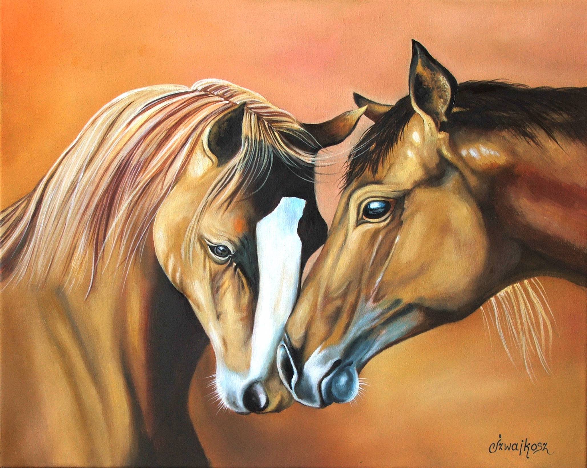 Obraz przedstawia dwa konie, z czułością zbliżone głowami. Tło jest nasycone odcieniami pomarańczu, co dodaje całości ciepła i nostalgii. Konie są namalowane w realistycznym stylu, z dużą dbałością o szczegóły takie jak błyszczące oczy i miękko opadające grzywy. Nasycenie barw i delikatne przejścia tonalne tworzą dynamiczny kontrast z subtelnym tłem. Obraz zaprasza do refleksji nad przyjaźnią i bliskością. Atmosfera jest pełna spokoju i delikatnej harmonii. Artysta użyczył olejnych farb, co można zauważyć po bogatej fakturze i głębi kolorów. Emocje, jakie budzi ten obraz, to głównie spokój i radość związana z bliskością zwierząt. "Te koniki są takie miłe!" – mogło by powiedzieć siedmioletnie dziecko, widząc to ciepłe przedstawienie. Coś w tym obrazie mówi "friendship", że w prostocie jest piękno. Kompozycja jest zbalansowana, a układ koni tworzy scenę wrażliwą i liryczną. Długie cienie i łagodne przejścia kolorów sprawiają, że obraz jest przyjemny dla oka. Każdy szczegół zdaje się krzyczeć o dbałości i miłości do natury. Może nie jest to dzieło, które szokuje, ale na pewno takie, które zatrzymuje na moment i pozwala odetchnąć.