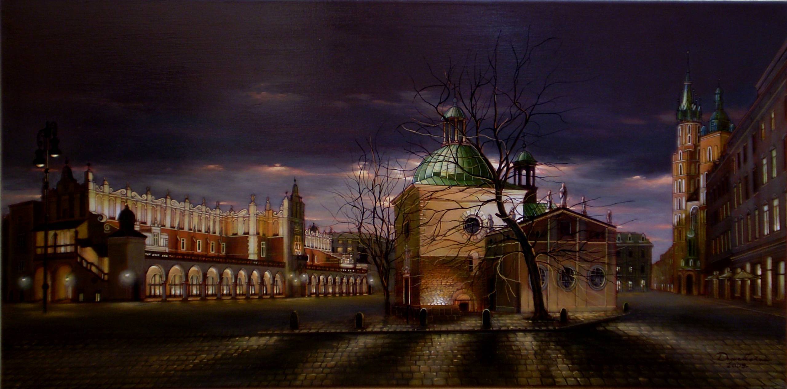 Obraz przedstawia nocną scenę na malowniczym rynku z bogatą architekturą. Dominują ciemne kolory, z nocnym niebem pełnym granatu i szarości. Lampy uliczne rzucają ciepłe, żółtawe światło na bruk, tworząc kontrast z chłodnym blaskiem księżyca. Centralnym punktem kompozycji jest barokowa budowla z charakterystyczną kopułą, otoczona nagimi drzewami, co dodaje dziełu nostalgii i lekkiego smutku. Ach, takie haunted wrażenie, prawda? Artysta zastosował realistyczną technikę malarską, uwypuklając detale architektoniczne i teksturę powierzchni. Światło i cień odgrywają tu kluczową rolę, co dodaje scenie głębi i dynamiki. Zachwyca subtelne cieniowanie i precyzja linii. Wyobraź sobie, jak zimny wiatr przemyka między budynkami, szepcząc historie dawnych czasów. Obraz emanuje spokojem, ale też pewną tajemniczością. Może budzić refleksję nad przemijaniem i ciszą zapomnianych miejsc. Czuję jakby czas się zatrzymał, a jedyna ruch to cień drżący na bruku. Dziecko powiedziałoby: „To wygląda jak z bajki przed snem!”. Czy jest tu jakiś hidden message? Może wystarczy tylko wsłuchać się w szept miasta.