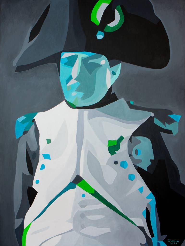 Obraz, który mamy przed sobą, to fascynująca podróż przez kalejdoskop kolorów i kształtów. Na pierwszy rzut oka dominują tu chłodne odcienie błękitu i zieleni, które kontrastują z głęboką czernią i jaśniejszymi szarościami. Figura, przypominająca sylwetkę historyczną, zdaje się unosić w abstrakcyjnej przestrzeni, gdzie linie są ostre, a formy zgeometryzowane. Artysta, eksperymentując z kolorem i kształtem, nadał postaci niemalże kubistyczny charakter, przez co całość wydaje się dynamiczna, mimo że zastygła w bezruchu. Atmosfera obrazu jest tajemnicza i nieco melancholijna. Game of contrasts – tak można by określić strategię, którą posłużył się twórca. Chociaż dzieło jest nieco chłodne w kolorystyce, to wywołuje silne emocje; jednocześnie przyciąga i dystansuje. Styl artystyczny zdradza fascynację nowoczesnymi technikami, może trochę surrealizmem, z wyraźnym wpływem sztuki abstrakcyjnej. To obraz, który może rodzić wiele interpretacji u odbiorcy. Dla niektórych może być symbolem władzy, dla innych zagadką do rozwikłania. Ten chłodny portret wydaje się zadawać pytania o tożsamość i historię. Patrząc na niego, można odczuć pewien dystans, ale też fascynację formą i kolorem. „To wygląda jak kolorowy robot!”, powiedziałoby pewnie dziecko. Obraz jest intrygujący i prowokuje do myślenia, pozostawiając widza z uczuciem niedosytu i chęcią poznania większej historii ukrytej za zgeometryzowaną sylwetką.
