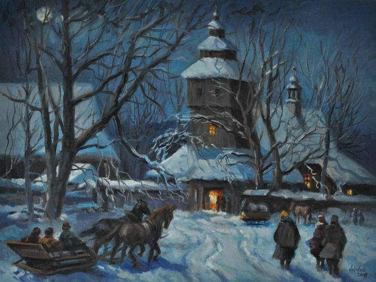 Obraz ukazuje zimowy wieczór, zatopiony w chłodnych odcieniach błękitu i szarości. Drzewa bez liści wyciągają swoje gałęzie ku zachmurzonemu niebu, jakby chciały dosięgnąć księżyca, który ledwo przebija się przez nocną mgłę. Na środku kompozycji stoi stara drewniana cerkiew, pokryta grubą warstwą puszystego śniegu, jej okna zdają się być jedynym źródłem ciepła, emanując subtelną pomarańczową poświatą. Świat na moment zamiera w ciszy, przerwanej tylko skrzypieniem śniegu pod końskimi kopytami. Atmosfera obrazu jest nostalgiczna, pełna spokoju, ale i lekkiej tajemniczości, ukrytej gdzieś między cieniami drzew a migoczącymi płomieniami świec w oknach. Technika artystyczna wskazuje na płynne pociągnięcia pędzla, które tworzą pełen dynamiki ślad na płótnie przypominający ruchy jednorodzinnej poezji. Artysta użył pastelowych kolorów, aby uzyskać harmonijną kompozycję i atmosferę pełną magii. Obraz może wywoływać intensywne emocje, wskazując na urok prostych codziennych chwil, które pośród blasku świateł wydają się niezwykle ważne. Patrząc na niego, myślę sobie, że te zimowe wieczory są jak ciepły koc – otulają ciało i duszę, dając poczucie bezpieczeństwa. "Look, konie ciągną sanie, jak w bajce" – powiedziałoby 7-letnie dziecko z entuzjazmem i szerokim uśmiechem.
