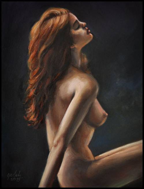 Na obrazie widzimy subtelnie uchwyconą postać kobiety, której ciało oświetla delikatne światło kontrastujące z ciemnym tłem. Kolory są ciepłe, dominuje tu paleta złotych i miedzianych tonów, które podkreślają miękkość i naturalność przedstawionej sylwetki. Kompozycja obrazu jest zrównoważona; kobieta zwraca uwagę wyrazistym profilem, a jej włosy układają się w miękkie fale. Obraz emanuje spokojem i intymnością, jakby scena została uchwycona w prywatnym momencie zadumy. Artystyczna technika jest realistyczna z delikatnymi pociągnięciami pędzla, które dodają głębi i tekstury. Można by powiedzieć, że artysta uchwycił essence chwili, oddając ciepło oraz kruchość kobiecej natury. To sprawia, że odbiorca zatrzymuje dech. Czujemy się jak voyeurowie, podglądający cichy moment introspekcji i spokoju. „A ja mam włosy jak ona!”, powiedziałby mały dzieciak, zwracając uwagę na lustrzane podobieństwa. Interpretacje tego obrazu mogą być różne. Dla jednych to symbol wolności i siły, dla innych chwila odprężenia i refleksji. Kompozycja przyciąga uwagę swoim intymnym klimatem. To trochę jak zachód słońca, który sprawia, że czujesz się nostalgicznie. Obraz ma w sobie coś, co jest "timeless", wiecznie aktualne, dotykające duszy i zachęcające do zatrzymania się na chwilę.