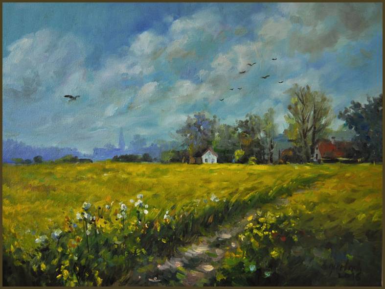 Obraz przedstawia sielankowy krajobraz, w którym dominują żywe, różnorodne kolory. Przeważająca zieleń pola zdaje się niemal pachnieć świeżością trawy. Kompozycja obrazu jest harmonijna, z małym białym domkiem subtelnie wplecionym w zarys drzew na horyzoncie. Nad polami unosi się kilka ptaków, dodając scenie lekkości i dynamizmu. Niebo jest przecudne, z puchatymi chmurami sunącymi leniwie po błękitnym tle. Atmosfera obrazu jest spokojna, wręcz nostalgiczna. Czuć tutaj pewien rodzaj ucieczki z codziennego zgiełku, chociaż na chwilę. Artysta zrobił dream-like impression przy użyciu miękkich pociągnięć pędzla, tworząc efekt niemalże rozmytych kształtów. Technika olejna dodaje głębi, podkreślając grę światła i cienia. Wpatrując się w ten obraz, można poczuć dziwną tęsknotę za prostotą. Ja bym się tam chciał bawić, mówiłoby dziecko. To miejsce, gdzie można po prostu być i oddać się marzeniom. Obraz może wywoływać fale różnych emocji, od radości po pewną refleksję nad ulotnością takich chwil. Wprowadza w stan kontemplacji i uspokaja duszę. Czyż to nie jest właśnie magia sztuki?