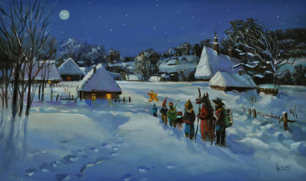 Na tym magicznym obrazie widzimy zimowy krajobraz pokryty śniegiem. Niebieskie niebo usiane jest gwiazdami i jasną pełnią księżyca. Kolory są stonowane, dominują zimne odcienie błękitu i bieli, ale ciepło bijące z okienek chat dodaje przytulności. Widzimy grupę ludzi idących przez śnieg. Mają na sobie kolorowe kostiumy, a jeden z nich niesie gwiazdę. Może to być jakaś lokalna tradycja, kolędowanie? Atmosfera jest idylliczna, spokojna, jakby zatrzymana w czasie. Artysta użył technik olejnych, co widać po miękkim przejściu barw i delikatnych pociągnięciach pędzla. Snopy światła z okien tworzą magiczną aurę, nadając obrazowi dreamy look. Patrząc na to dzieło, czuję ciepło wspomnień z dzieciństwa. Wygląda to jak scena z bajki, a ja wyobrażam sobie, że toczymy bitwę na śnieżki. Kompozycja jest dobrze zbalansowana, skupia się na centralnym motywie – postaciach i ich podróży. Taki obraz może obudzić w nas uczucia tęsknoty za prostymi, szczęśliwymi chwilami.