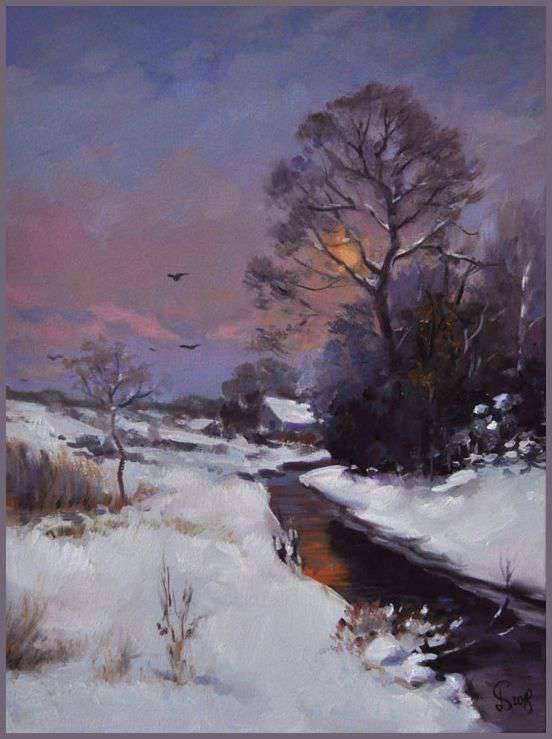 Obraz przedstawia zimowy krajobraz o zachodzie słońca, który rozgrzewa serce swoim nostalgicznym pięknem. Dominują tutaj chłodne odcienie błękitu i bieli, które kontrastuje delikatny różowy i pomarańczowy blask na niebie. Śnieg pokrywa ziemię, tworząc miękką, niemal bajkową scenerię, w której ciemne sylwetki drzew rysują się tajemniczo na tle zmieniającego się nieba. Kompozycja obrazu prowadzi wzrok wzdłuż rzeki wijącej się przez śnieg, aż po niewielką chatkę ukrytą w oddali. Atmosfera jest cicha, jakby czas stanął w miejscu. Czuć spokój i jednocześnie lekką melancholię, coś jakby whisper of winter's end. Styl artystyczny tego dzieła to realizm z nutką impresjonizmu. Widać tu precyzyjne pociągnięcia pędzla, podkreślające fakturę śniegu i drzew, a jednocześnie miękkość blendowania kolorów na niebie zachwyca. Obraz zachęca do refleksji i pobudza wyobraźnię. Może wywołać u odbiorcy poczucie tęsknoty za miejscami, gdzie czas płynie wolniej. Czujesz, że chciałbyś tam być, śmiać się i bawić w śniegu jak dziecko. Ten zimowy pejzaż przypomina mi kolorowe wieczory spędzone przy ciepłym kominku. Magiczny.