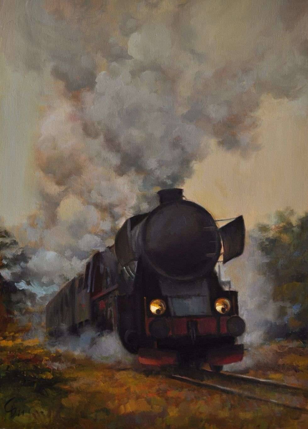 Na obrazie widzimy stary parowóz, który mknie po torach, a wokoło niego unosi się gęsta mgła dymu. Dominują ciemne, ale ciepłe kolory — brązy, żółcie i zielenie, które świetnie kontrastują z szarością dymu. Kompozycja obrazu sprawia wrażenie, jakby pociąg wyłaniał się z mgły, dodając obrazowi dynamiki i tajemniczości. Nastrój emanuje spokojem zmieszanym z nutką nostalgii. Artysta użył techniki impasto, co widać po delikatnych fakturach dymu. Użycie szerokich, płynnych pociągnięć pędzla dodaje pejzażowi realizmu, jednocześnie nadając mu trochę romantycznego charakteru. Wyziera z tego obrazu szum dawnych czasów, kiedy podróże koleją były czymś magicznym. Czuję, jakby można było niemal usłyszeć stukot kół o tory. Myślę sobie "steam power" — to jedno krótkie angielskie wyrażenie idealnie oddaje tę siłę i dynamikę. Mały widz mógłby powiedzieć: "Pociąg jedzie jak superbohater!" Obraz wywołuje emocje związane z podróżą w nieznane, przyjemne dreszcze oczekiwania. Może budzić w każdym nutkę melancholii za czymś minionym, ale też zachwyt nad pięknem przemijającej chwili.