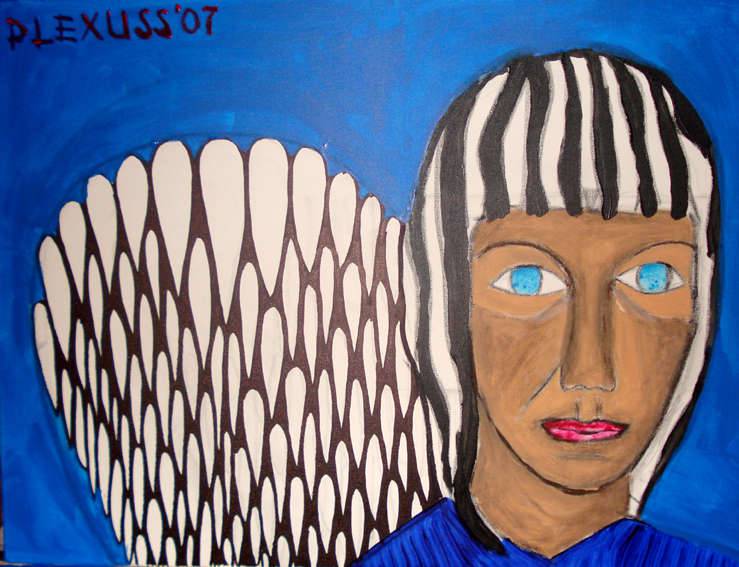 Obraz przedstawia postać na tle intensywnie niebieskiego koloru, który niemal hipnotyzuje swoją głębią. Rysy twarzy są wyraziste, oczy niebieskie jak niebo w słoneczny dzień. Włosy mają czarno-białe pasy, niczym zebra, co nadaje całości nieco awangardowy charakter. Skrzydła przypominają pióra, ułożone w symetryczny wzór, a ich kontrastowy biało-czarny design wyróżnia się na tle jednolitego błękitu. Atmosfera jest trochę tajemnicza, trochę surreal. Mamy wrażenie, że postać zaraz przemówi do nas jakimś sekretem. Styl artystyczny jest bardzo minimalistyczny, a jednocześnie pełen ekspresji. Artysta posługuje się prostymi formami i mocnymi kolorami, co daje efekt wow. To jakby połączenie świata rzeczywistego z jakimś magicznym. Można poczuć zaskoczenie, trochę niepokoju, ale i fascynację. Ktoś mógłby powiedzieć, że wygląda jak postać z bajki, i miałby rację. To dzieło potrafi wzbudzić emocje, możemy się zastanawiać, co autor chciał przez to powiedzieć. A ja się czuję, jakbym odkrywał nowy świat, patrząc na to dzieło. Takie "mystery". Każdy element zdaje się być na swoim miejscu, tworząc harmonijną, choć intrygującą całość. Czasem sztuka właśnie taka bywa – zaskakująco prosta, a jednak głęboka jak ocean.