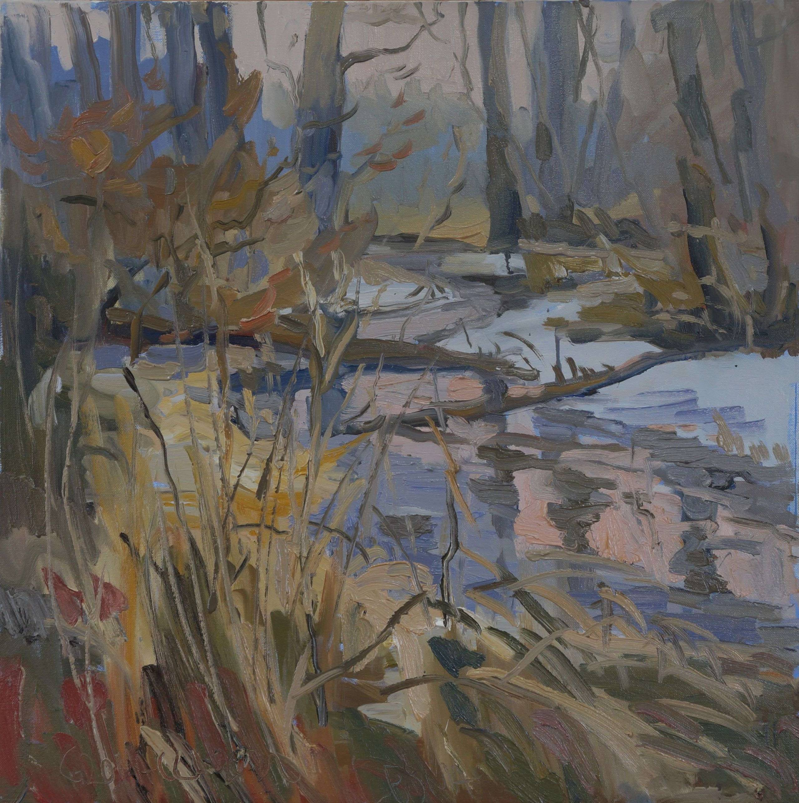 Obraz emanuje spokojem i tajemniczością leśnej scenerii. Dominują chłodne odcienie niebieskiego, szarości i zieleni, które tworzą nieco melancholijny krajobraz. Ciepłe brązy i żółcie wplatają się w kompozycję, nadając jej nutkę dynamizmu. W centrum uwagi jest spokojna rzeka, z gałęziami wrastającymi w jej taflę. Technika artystyczna zdaje się czerpać z impresjonizmu, co widać w szybkim, energicznym ruchu pędzla i niewielkich, ale wyraźnych plam kolorów. Obserwując obraz, można poczuć jakby zimowy chłód ocierał się o skórę. Atmosfera jest trochę jakby nostalgic, ale i pełna jakiejś wielkiej naturalnej ciszy. Może to miejsce, gdzie czas przestaje mieć znaczenie, a myśli odpływają wraz z nurtującą wodą. Maluje się przed oczami historia o spokoju i harmonii przyrody, która potrafi zatrzymać na moment cały świat. Ktoś może tu zobaczyć swój własny azyl, miejsce do refleksji i wewnętrznego wyciszenia. Dzieciak powiedziałby: "To jest las z bajki!". Dzieło pobudzi wyobraźnię i zostawi przestrzeń na osobistą interpretację. I myślę sobie: wow, ten artysta naprawdę potrafi uchwycić nieuchwytną piękność codziennych chwil.